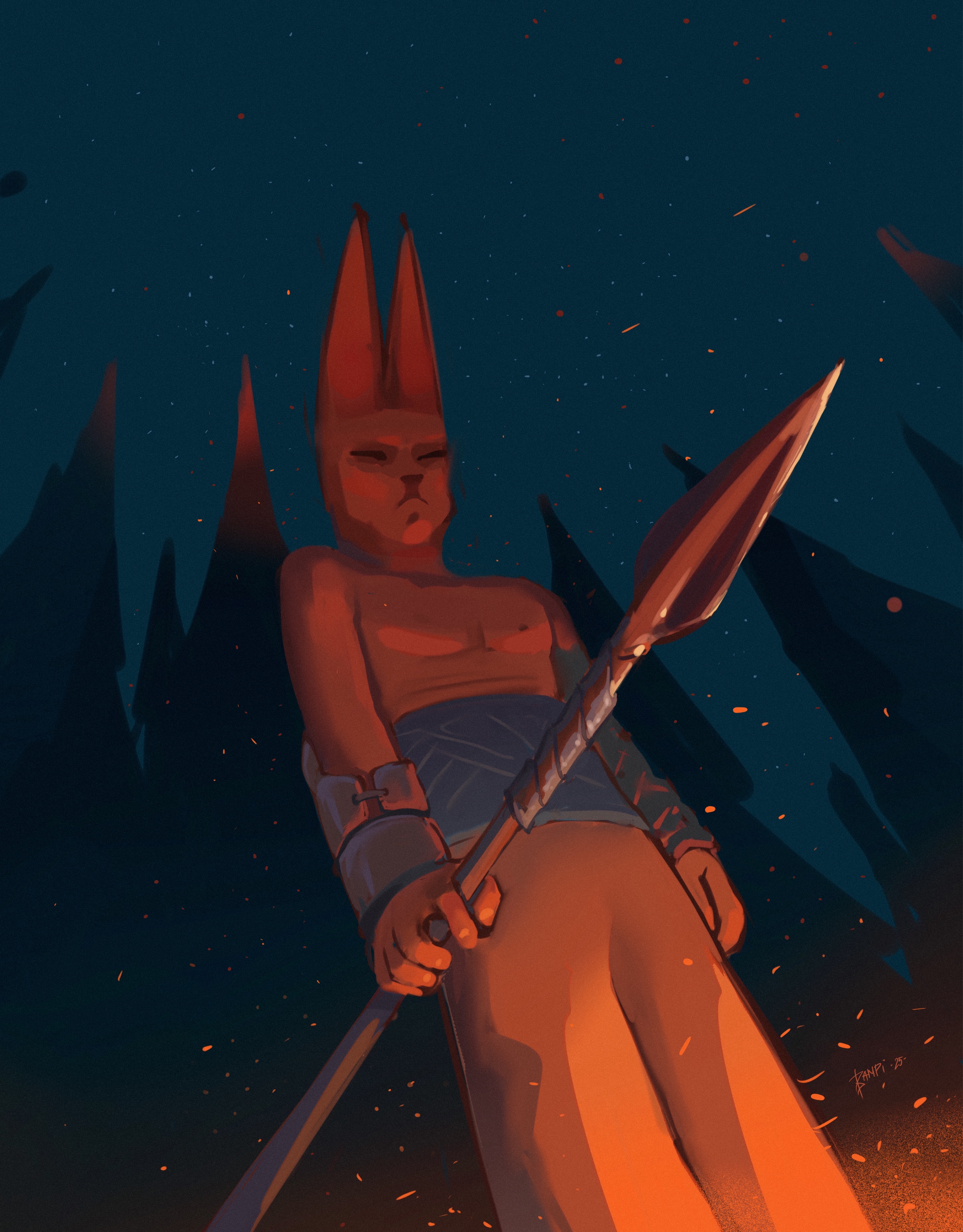 A hare warrior on the eve of an upcoming battle. He looks into the fire and thinks about his fallen friends, whom he will avenge tomorrow.