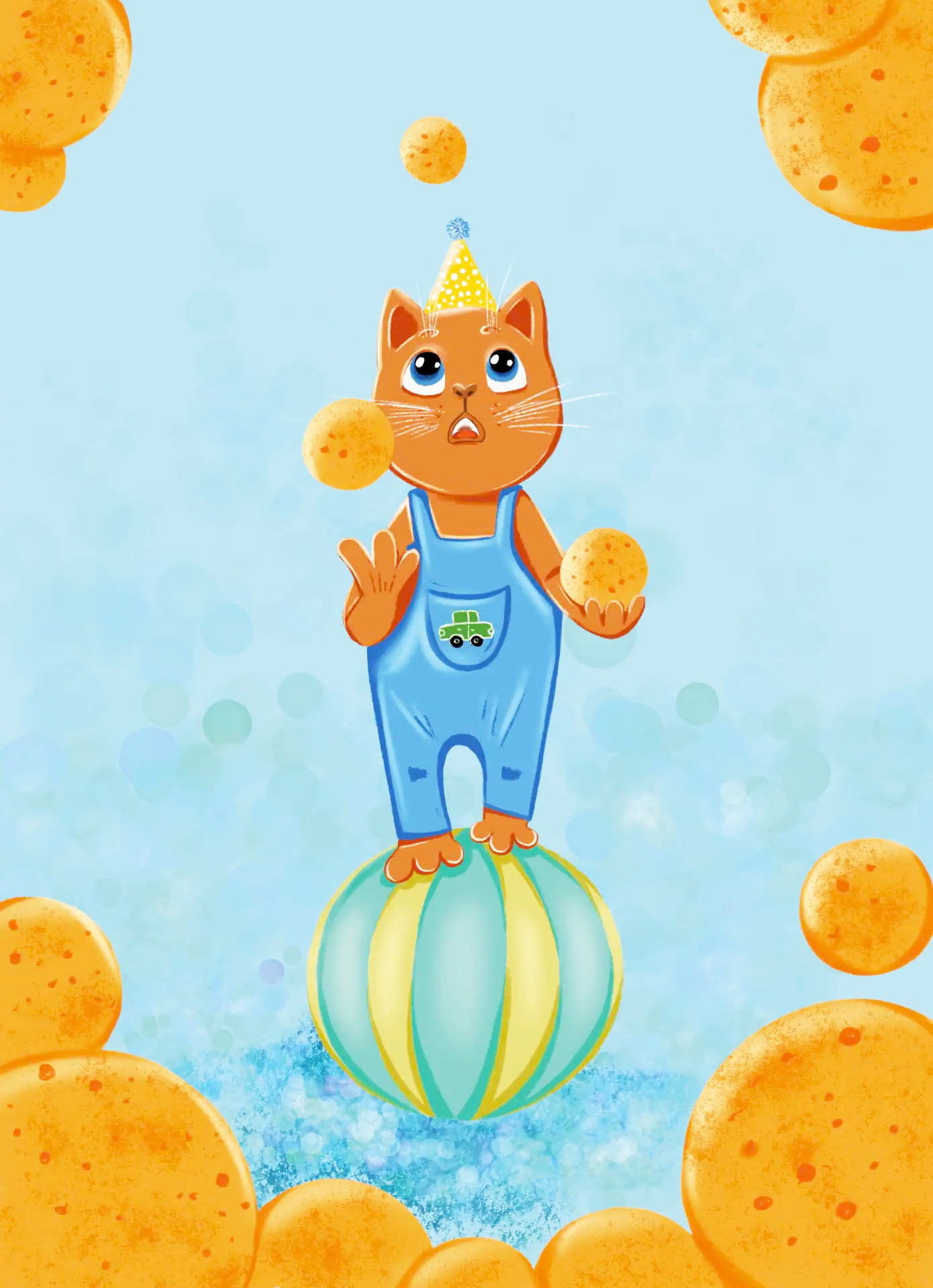 детская книжная иллюстрация про котенка Савелия, который хотел научиться жонглировать)