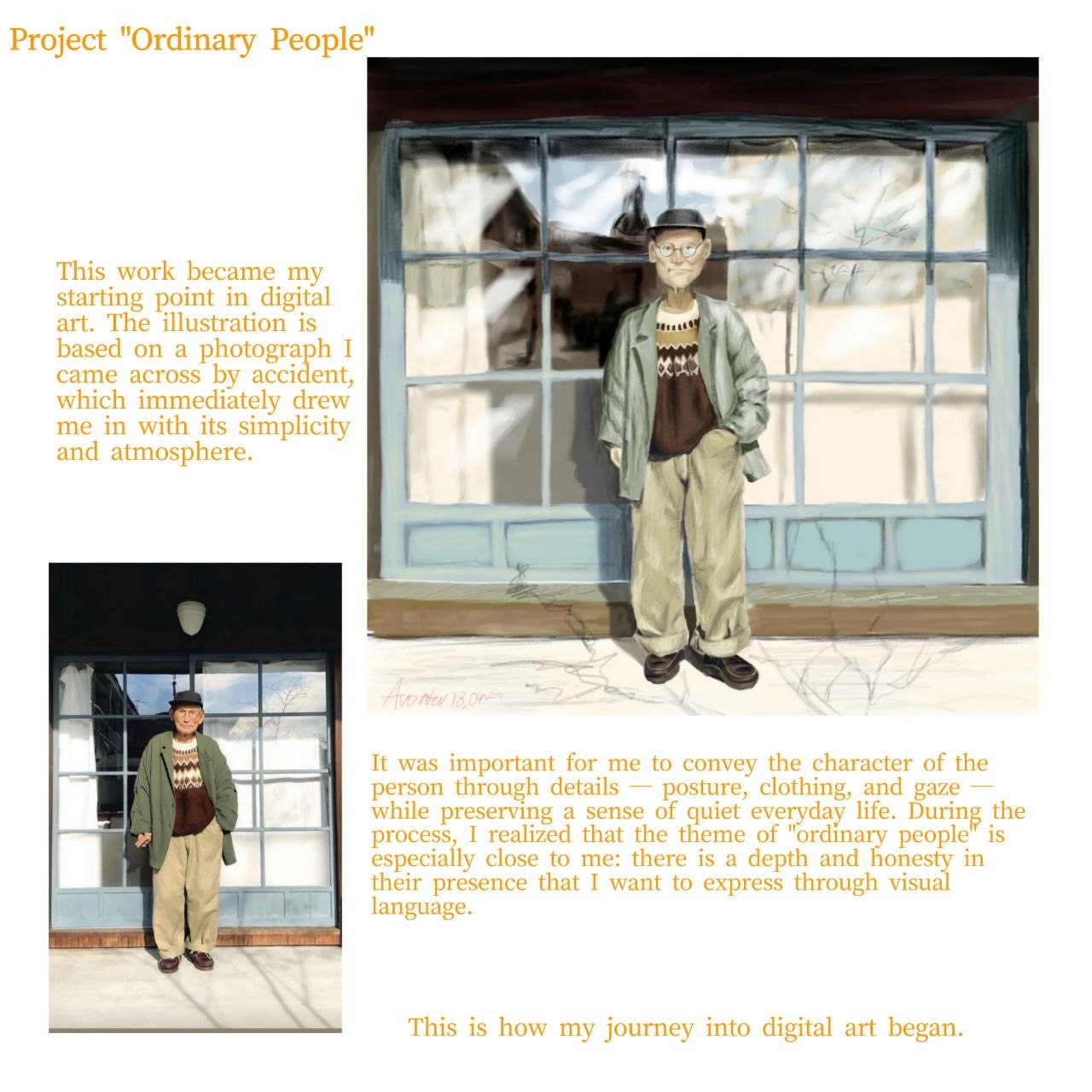 Для меня было важно передать характер человека через детали - осанку, одежду и взгляд - сохраняя при этом ощущение спокойной повседневной жизни. Во время процесса я понял, что тема «обыкновенных людей особенно близки мне: в их присутствии есть глубина и честность, которую я хочу выразить с помощью визуального языка.