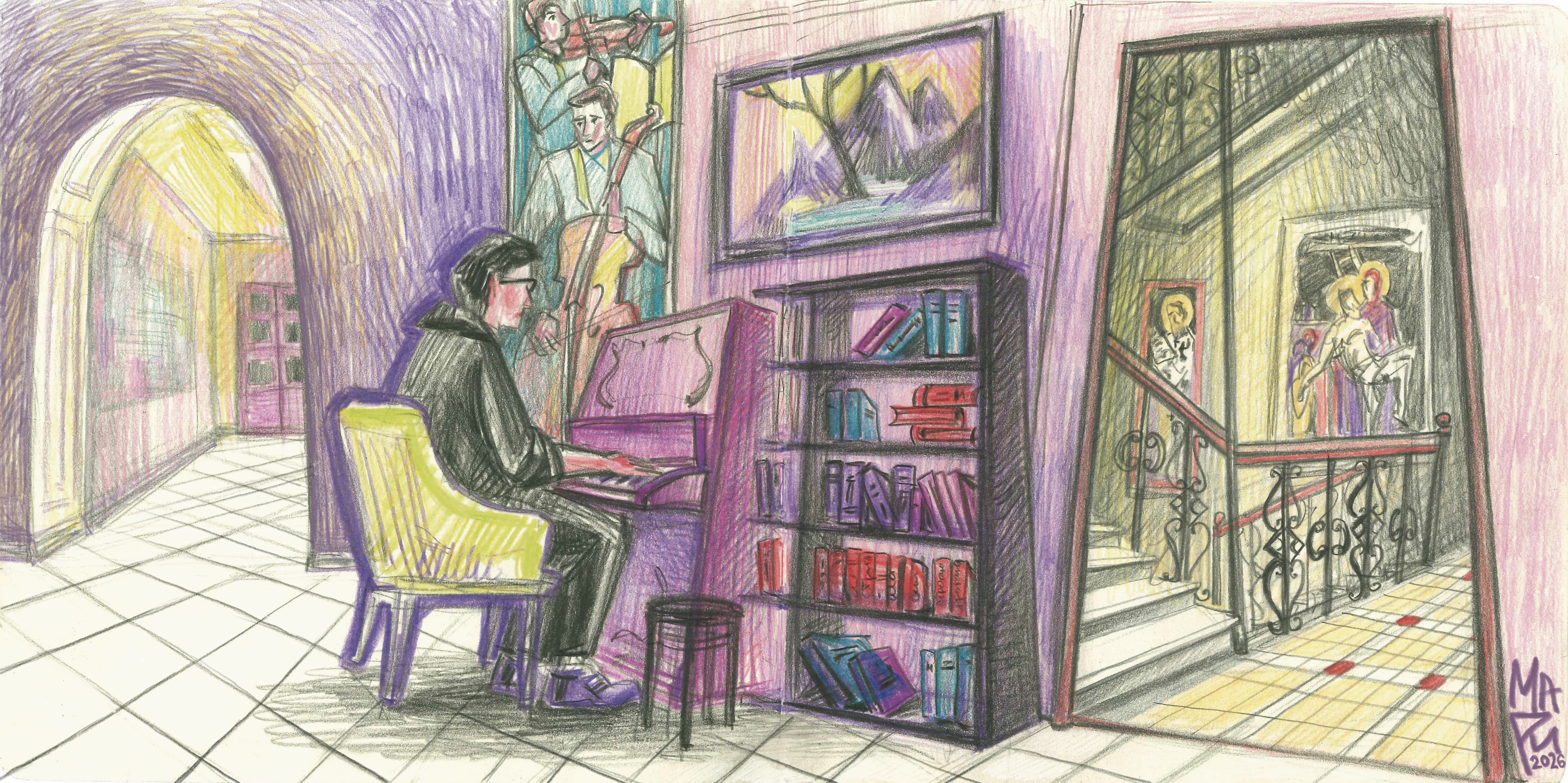 A work from a series of sketches of the Stroganov Academy. Sometimes in the evenings, one of the students or a security guard sits down to play the piano. Then the music spills through the corridors and stairwells, reaching all the way to the painting department.