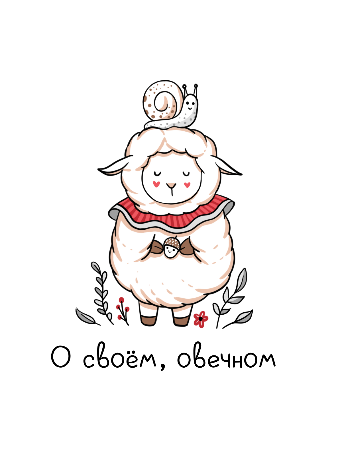 Милая овечка в воротничке держит жёлудь, на голове сидит улитка