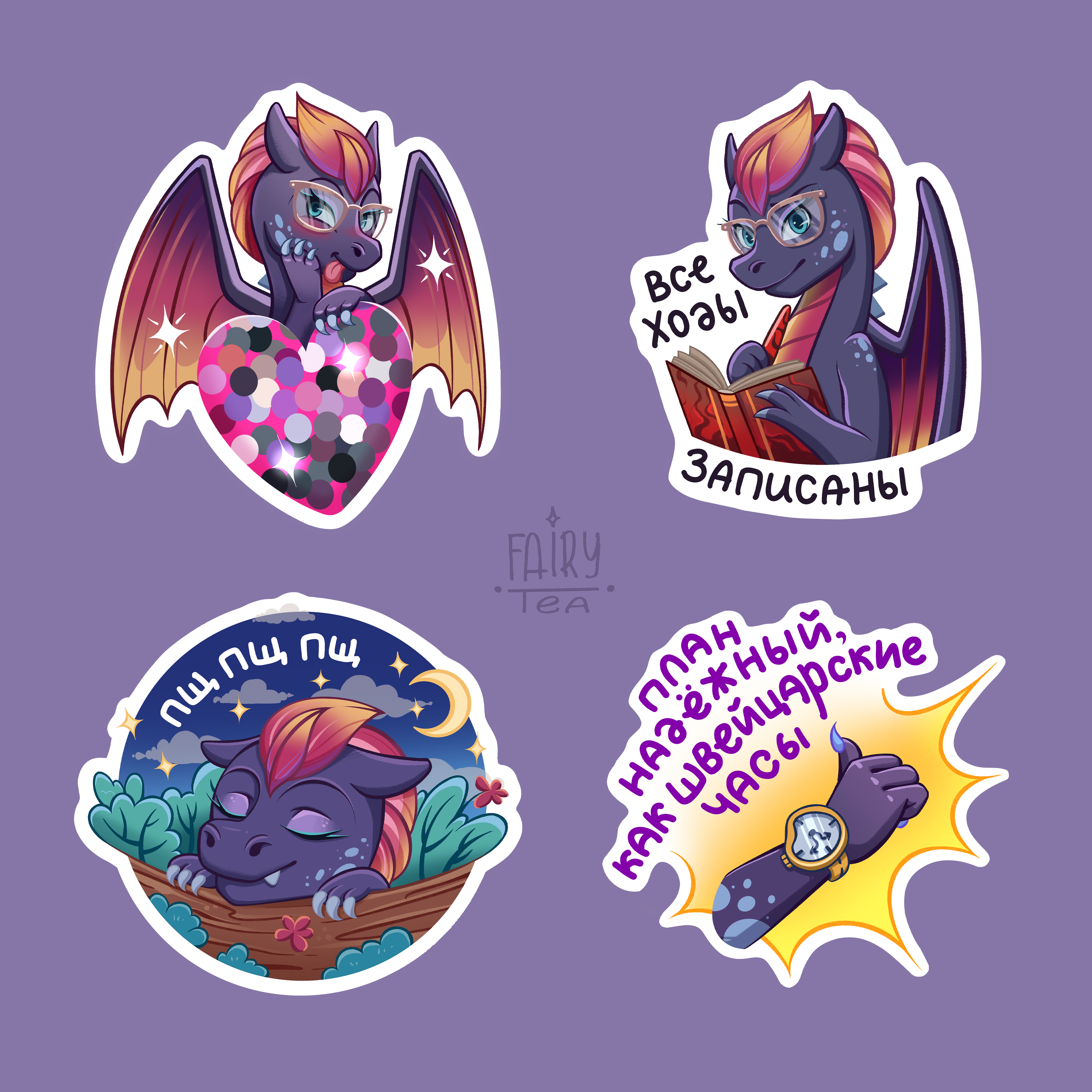 A personalized sticker pack for Telegram and WhatsApp. As part of the sticker pack's creation, a dragon character was designed according to the client's specifications, and then the stickers were drawn.