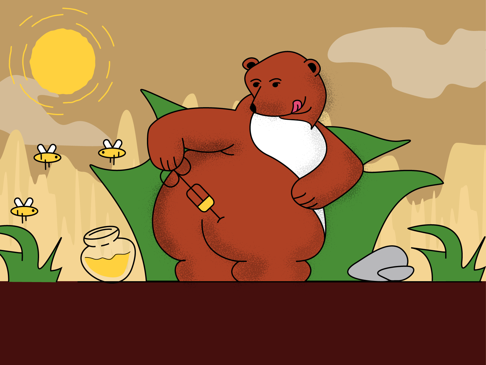 На векторной иллюстрации изображен медведь, который вкалывает себе очередную дозу меда. Помимо медведя на иллюстрации изображены другие предметы: пчелы, солнце, облака, зелень, горы.