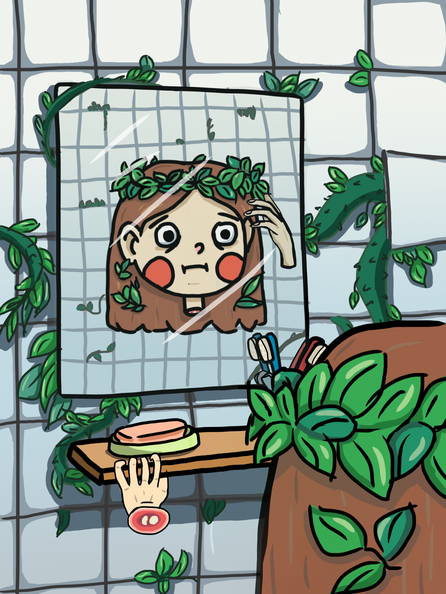 Девочка на против зеркала и всепоглощающее ее одиночество изображённое в виде мифических ростков пробирающиеся в ее ванную комнату (или самое уединенное место в ее душе)