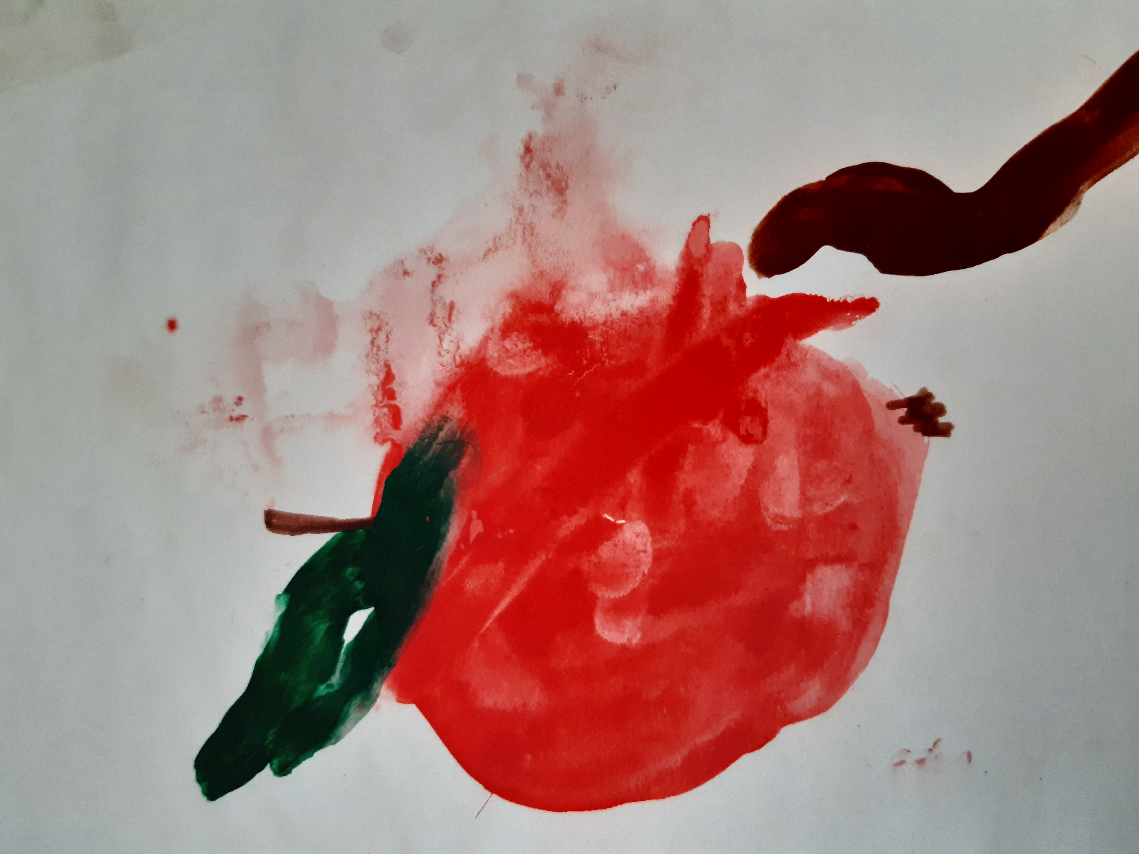 Рисунок рукой ребенка,который совсем не любит рисовать. Мы все похожи немного на это яблоко, к которому приближается маленький червячок. Мы обратили внимание на грозное лицо яблока и удивленное лицо червячка. Запретный плод наверное сладок? Я думаю смысл этого рисунка стоит больше.....