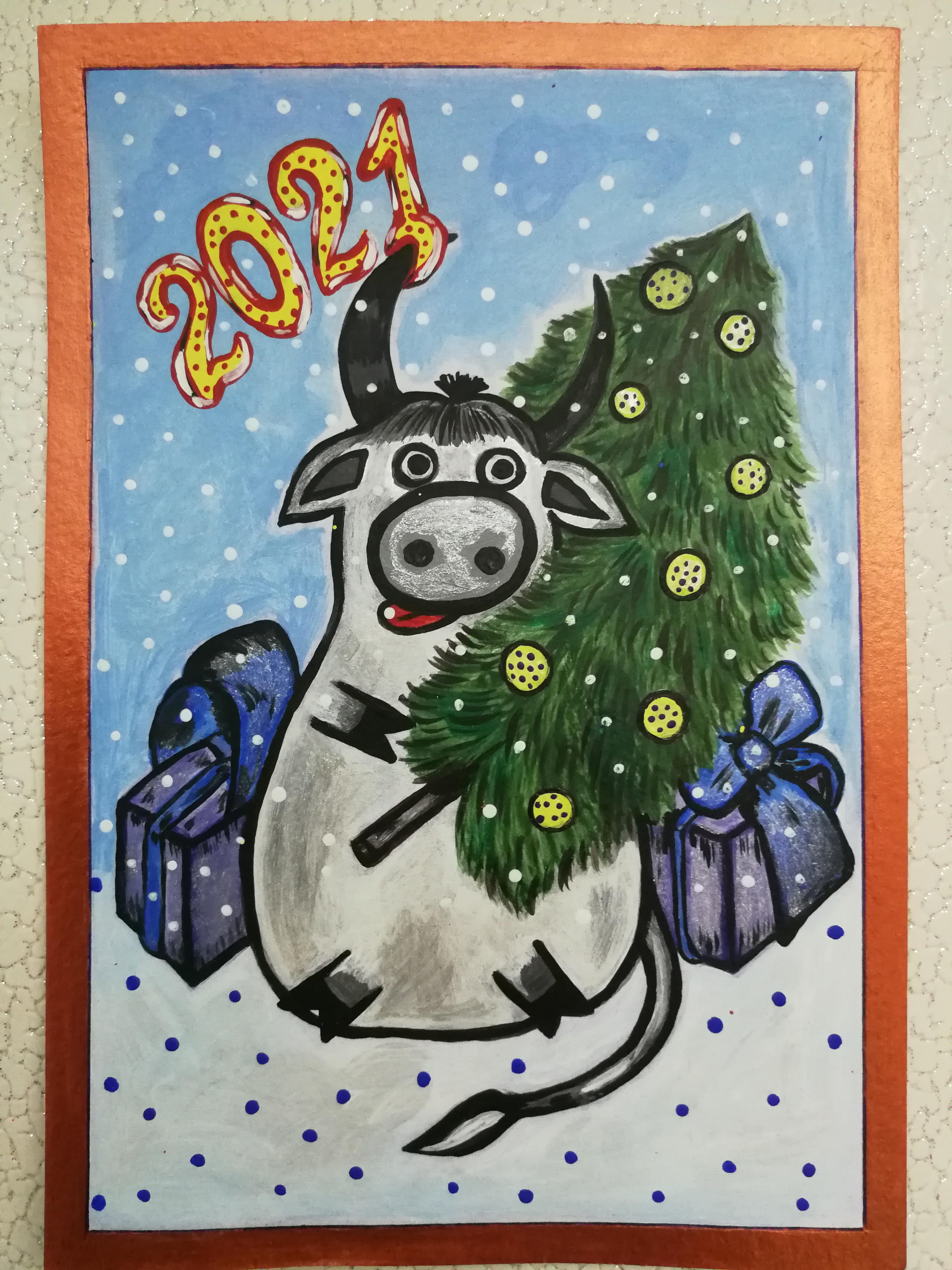 Иллюстрация шуточная на тему Нового года 2021 (металлический белый бык). Выполнена акрилом, размер картинки 17,5 на 11,7 см. Предлагается как картинка для календарика, открытки, конверта с новогодней тематикой.