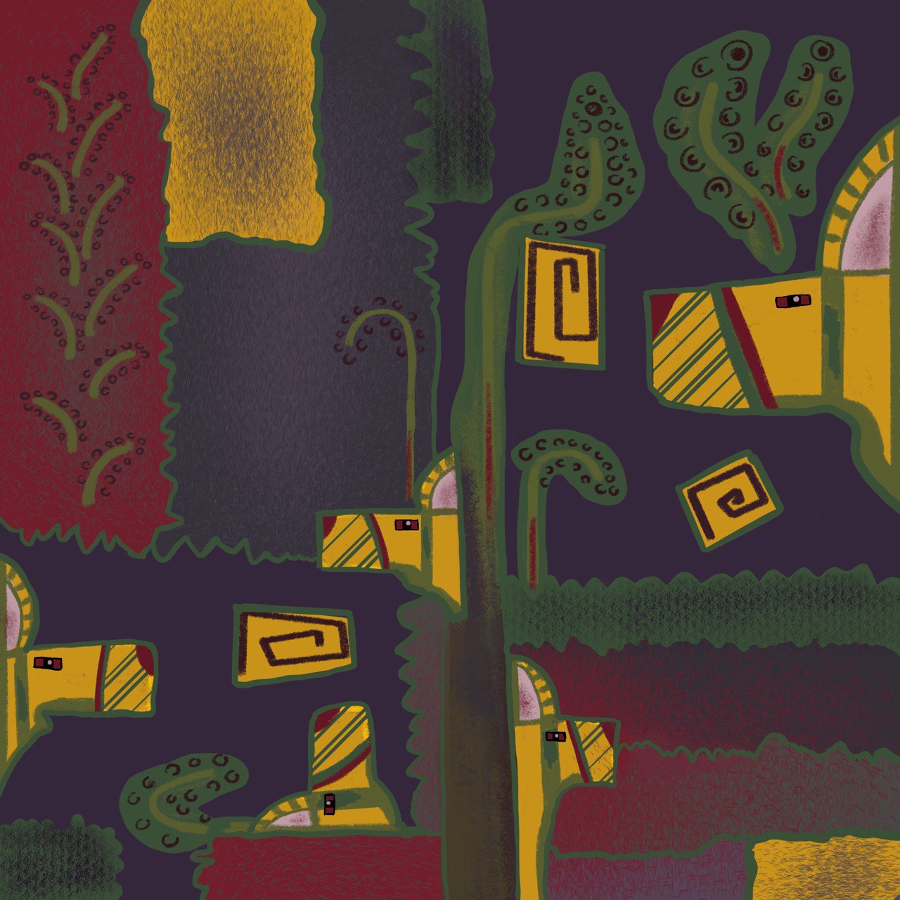 Стилизация волков в лесу, в начале волков совсем не было, но после разработки стилизированого леса, пришла в голову идея изобразить желтых волков, почему желтых, да потому что.