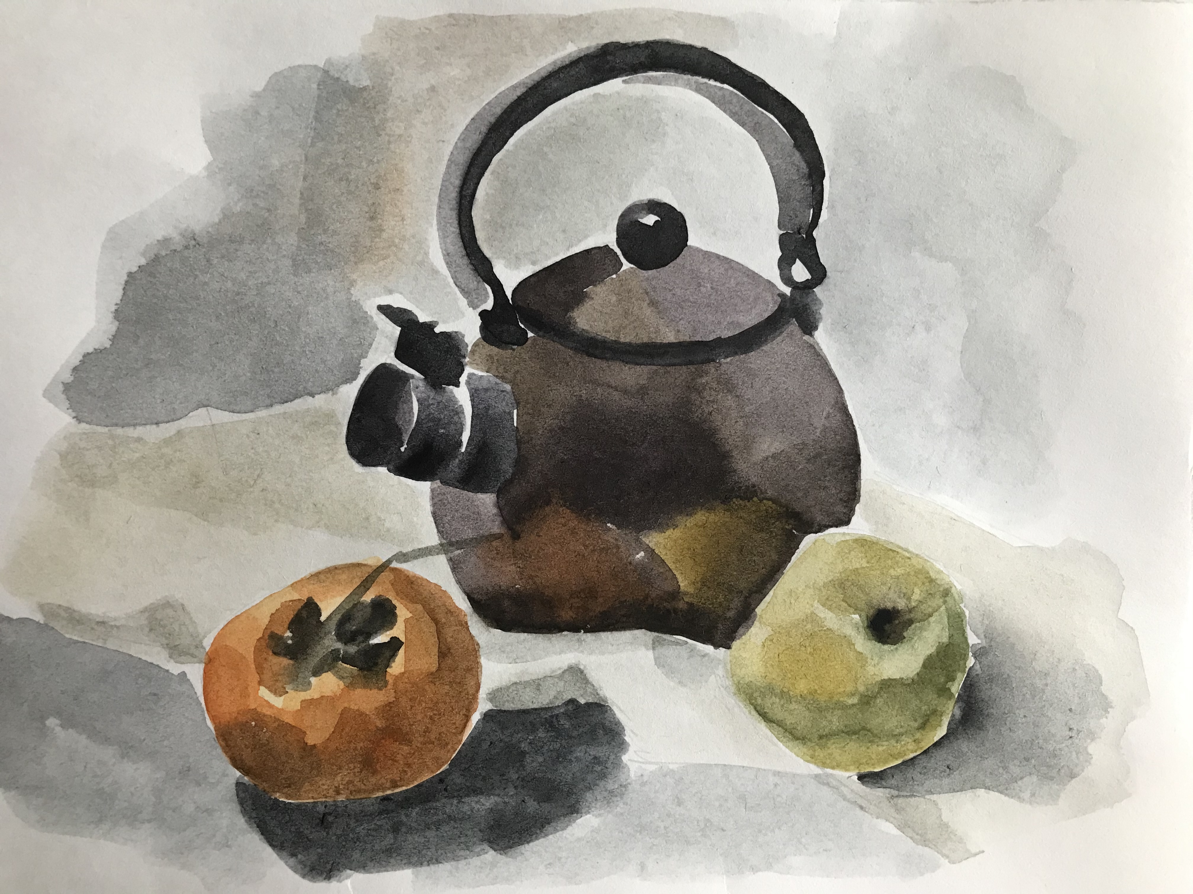 Чайник, хурма и яблоко