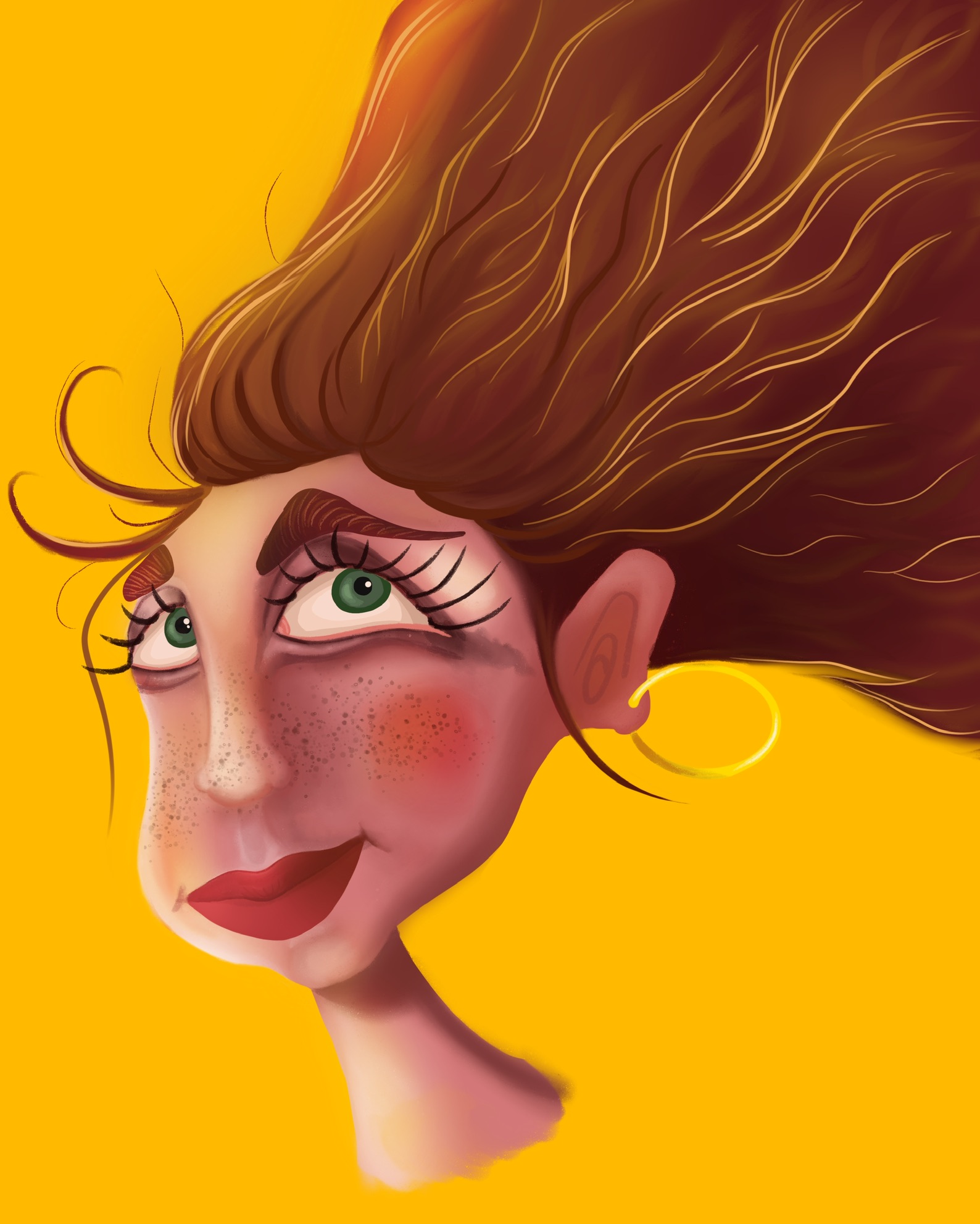Рыжая мечтательная девушка, в стиле мульт персонаж, развивающиеся волосы, зелёные глаза, веснушки.