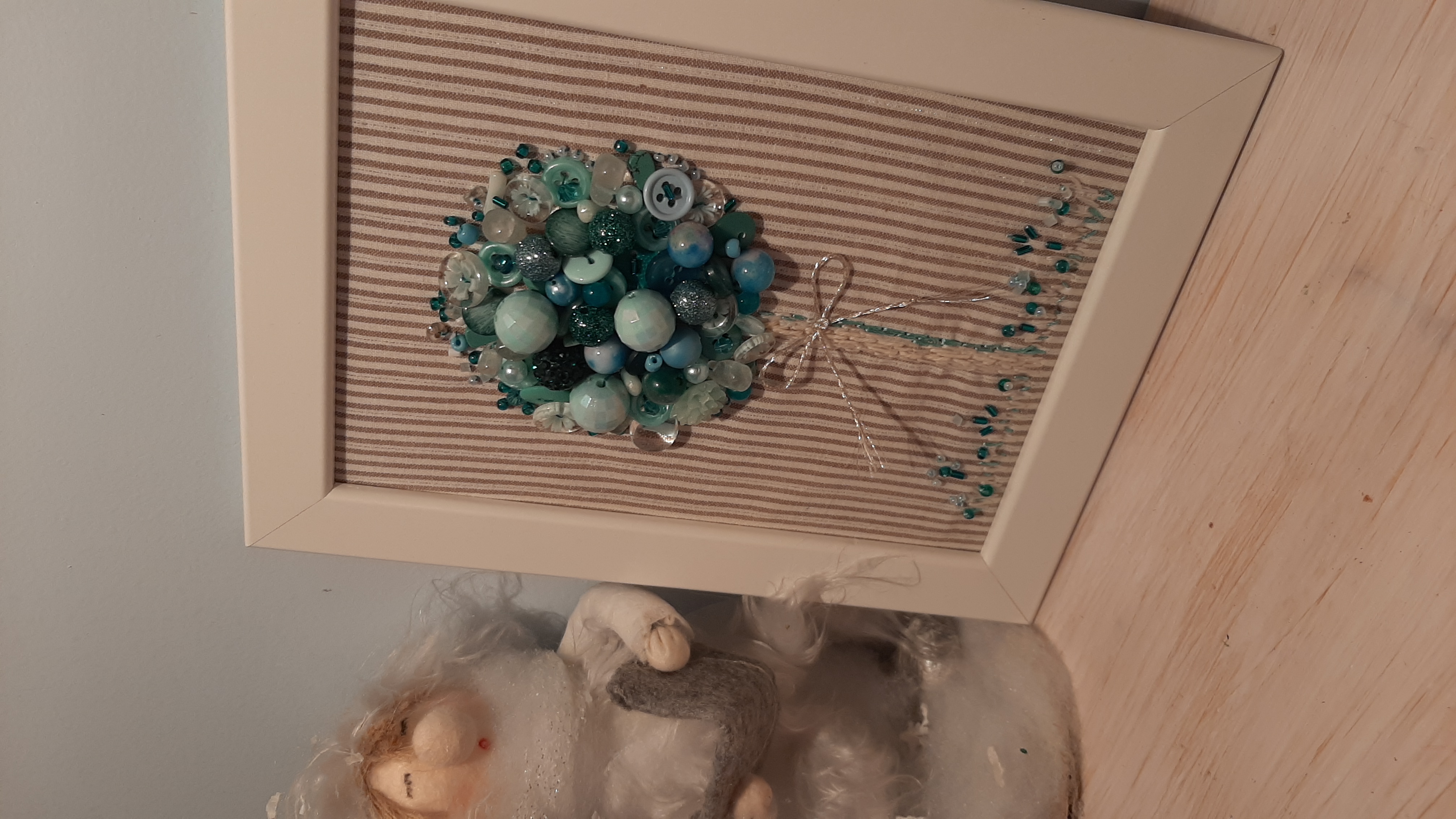Создана мною из бусин, пуговиц, бисера на индийском хлопке. Так же оформлена вышивкой.