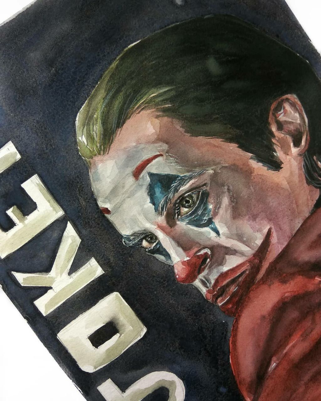 Картина выполнена в технике акварель + гуашь. Я передала тот самый взгляд Джокера. Вы можете приобрести эту работу и украсить ею интерьер или подарить кому-то.