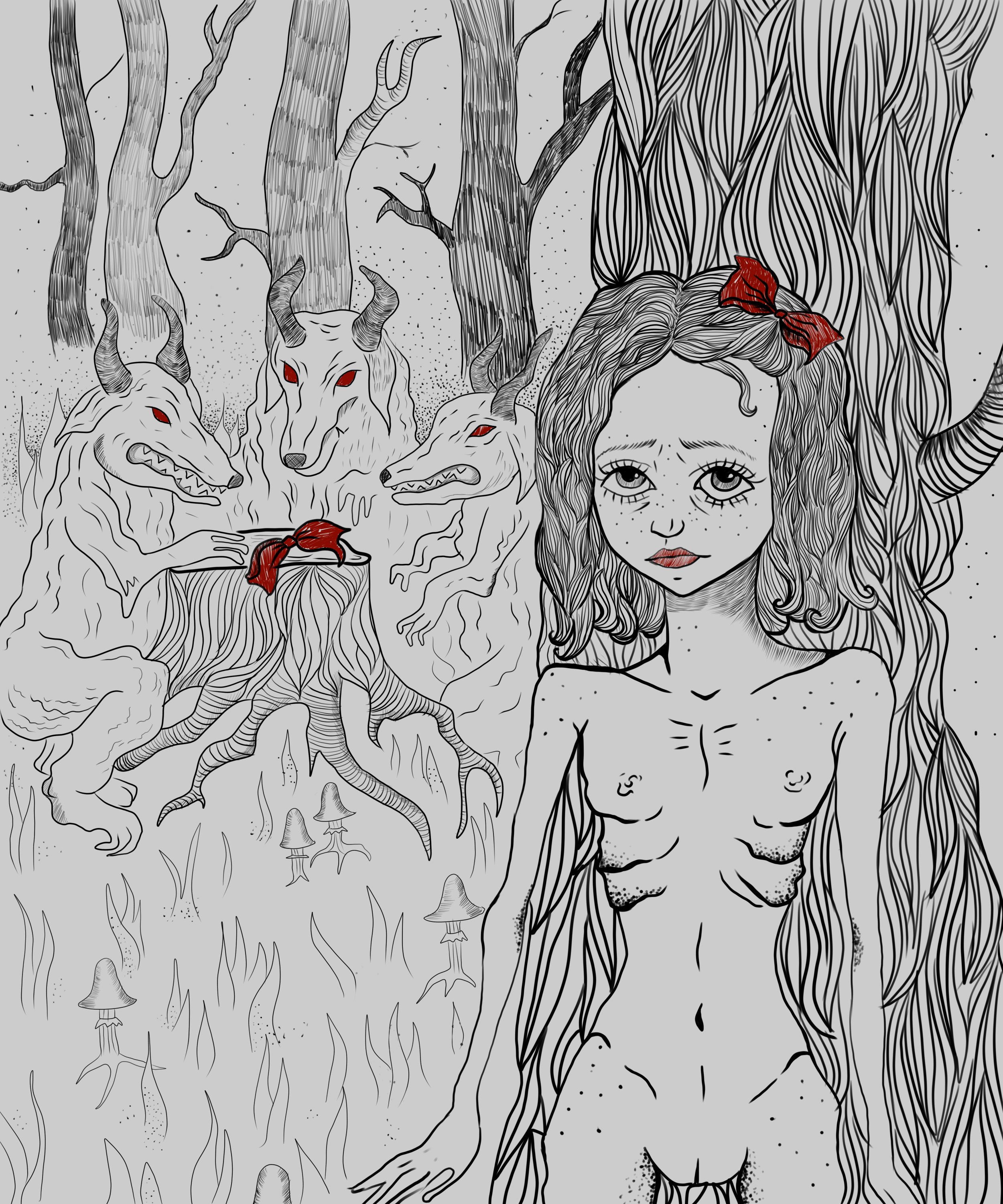 Полноразмерное изображение предоставляется. Девочка в лесу. Иллюстрация к книжке, "которую небрежно раскрасил ребенок"..................................