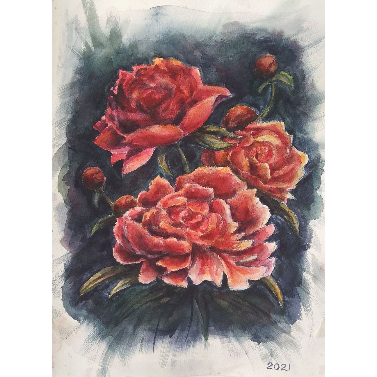 Акварельный этюд пионов на хлопковой бумаге. Размер работы 27*36 см