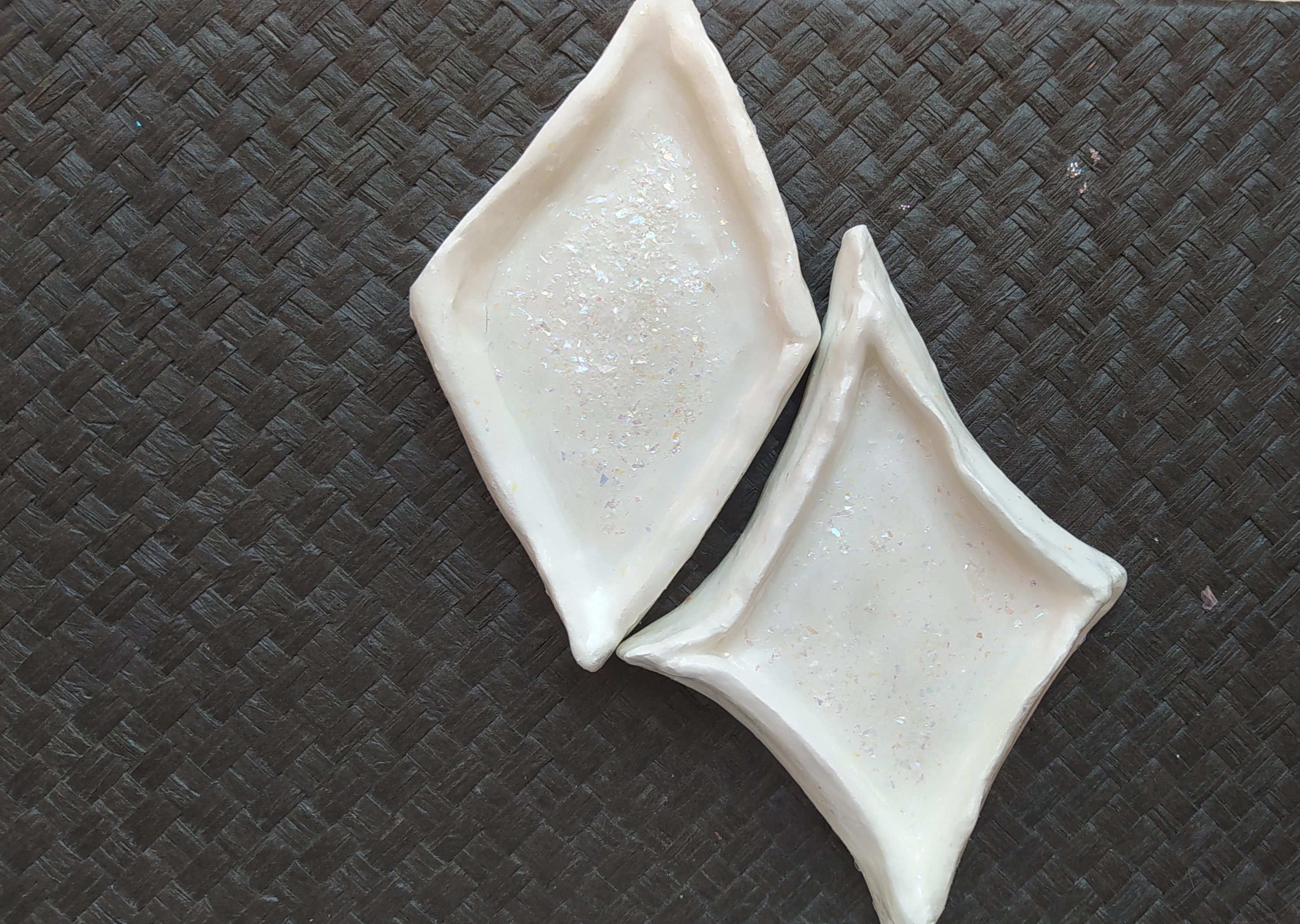 Материал: белая глина, глянцевый лак, лак с глиттером и воображение.