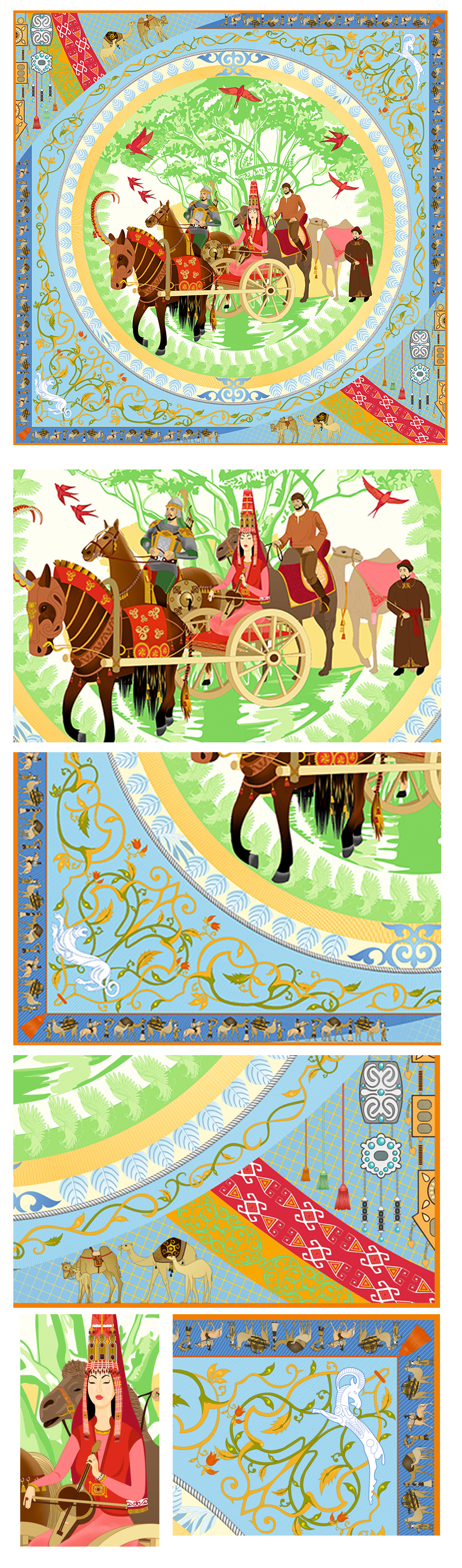 Самый необычный дизайн рисунка, я нарушаю все грани, симметрию, делаю вашу жизнь краше, ваш стиль неповторимым, На платке изображена " Великолепная царица Томирис", лошади , верблюды, необычайно красивые орнаменты которых дополняют тюльпаны. Это мое виденье древнего Казахстана.