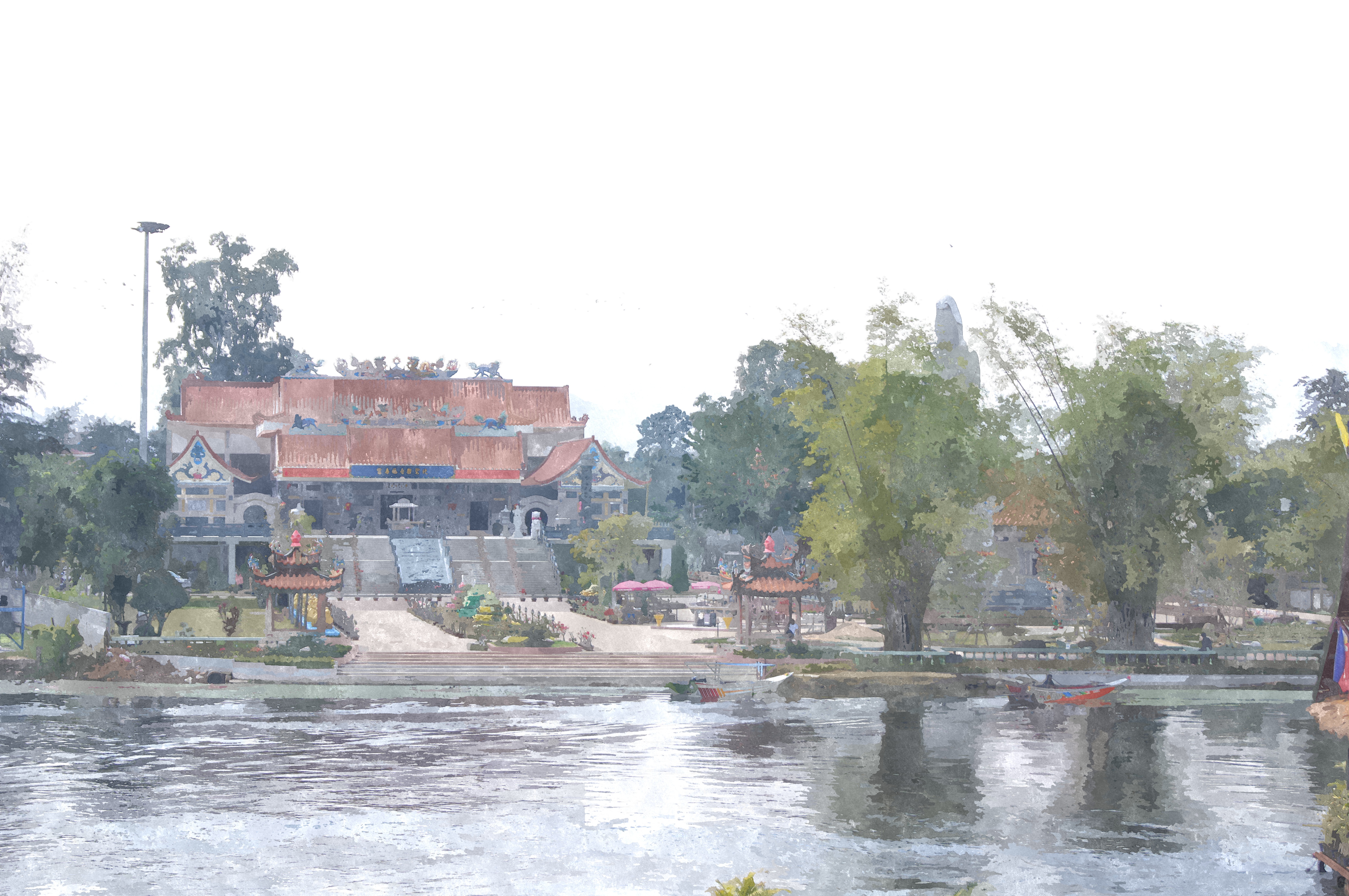 Таиланд. Здание с красной крышей на берегу реки Квай.