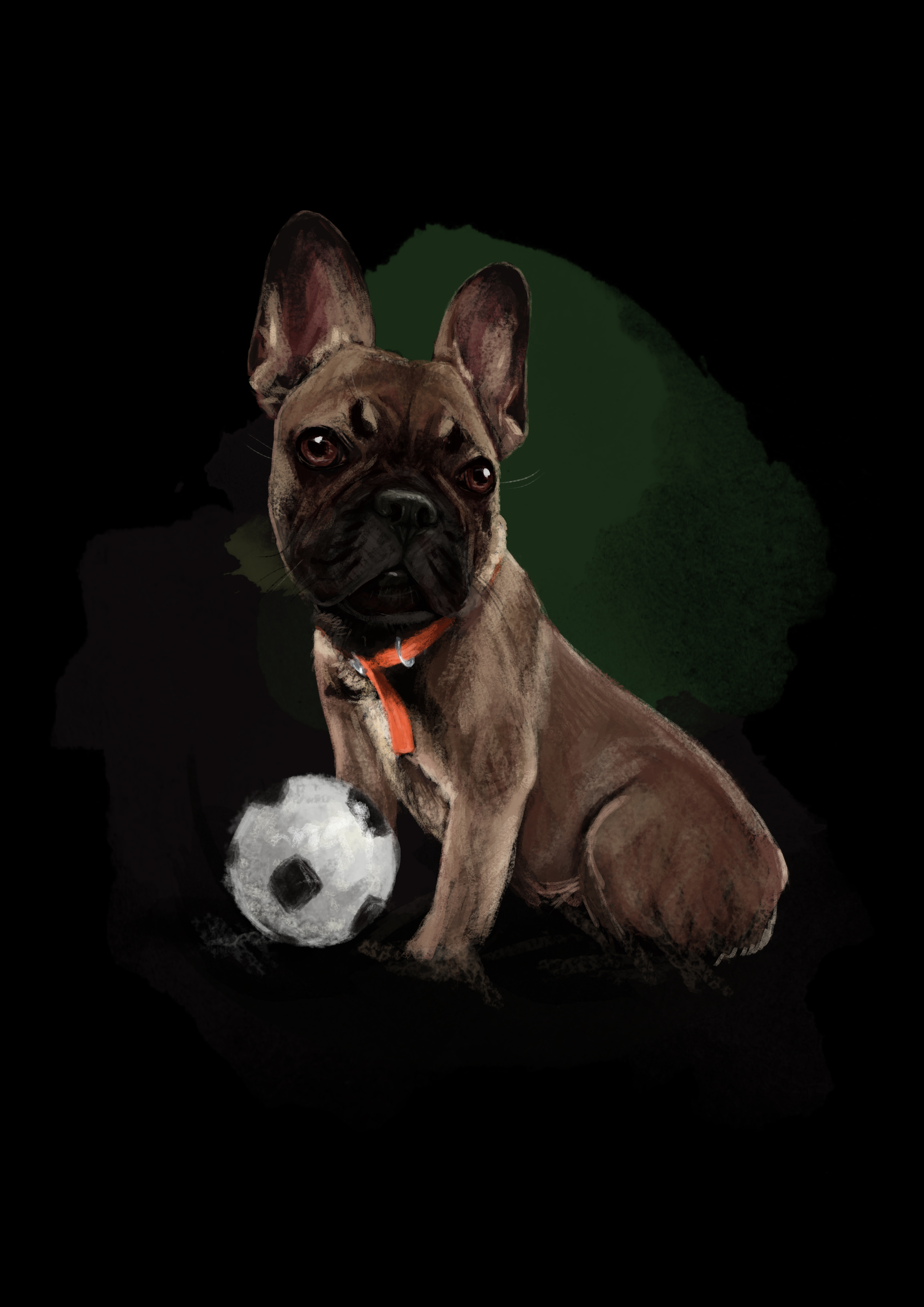 Рисунок французского бульдога с футбольным мячом на темном фоне. Файл уже оформлен под формат А3 и, соответственно, может быть напечатан вами в данном размере или меньше. Благодаря тому, что собака находится на однородном черном фоне, вы легко сможете отформатировать изображение под другой нужный вам размер.