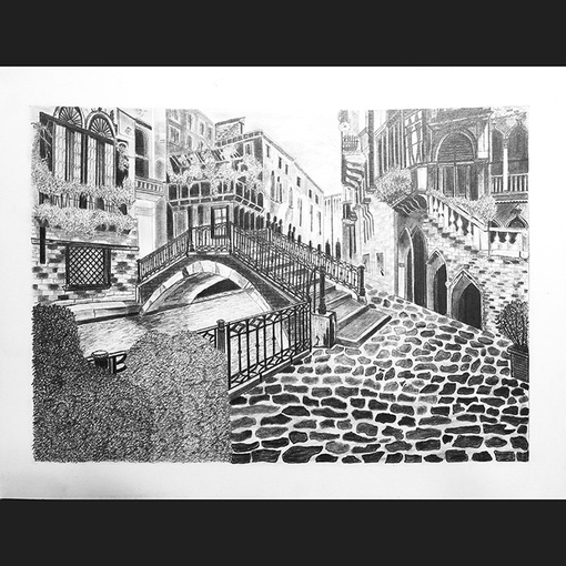 Работа выполнена чернографитным карандашом на плотной гладкой бумаге белого цвета.