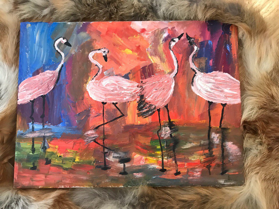 Картина нарисованная масляными красками "Фламинго". Размер картины 30х40. Картина маслом для поднятия настроения и уюта в доме, так же подойдет на подарок.