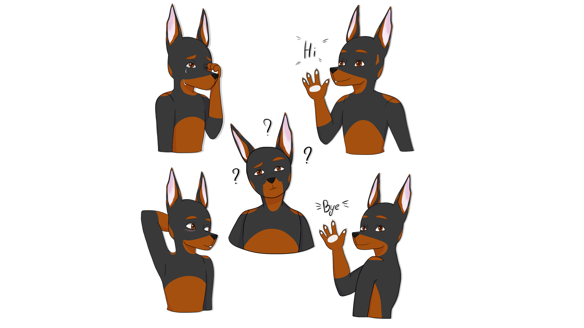 Стикерпак из 5 стикеров собаки. Собака Доберман. Стикеры с пятью эмоциями: "застенчивый", "грусть", "непонимание", "приветствие" и "прощание".