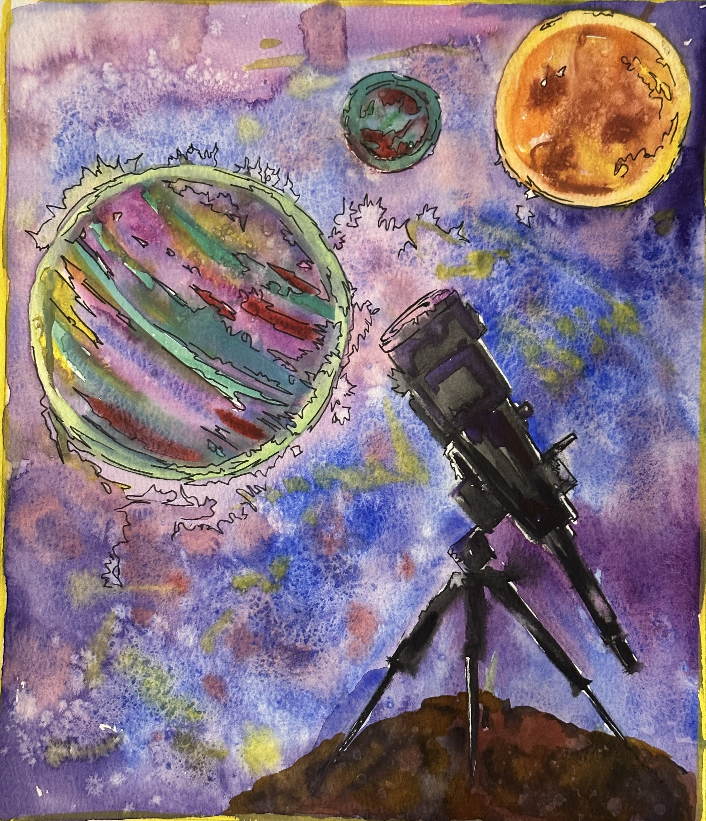 астрономия, космос, планеты, телескоп, ночное небо. Тематическая открытка учителю, преподавателю, любителю астрономии. Акварель, линер, смешанная техника.