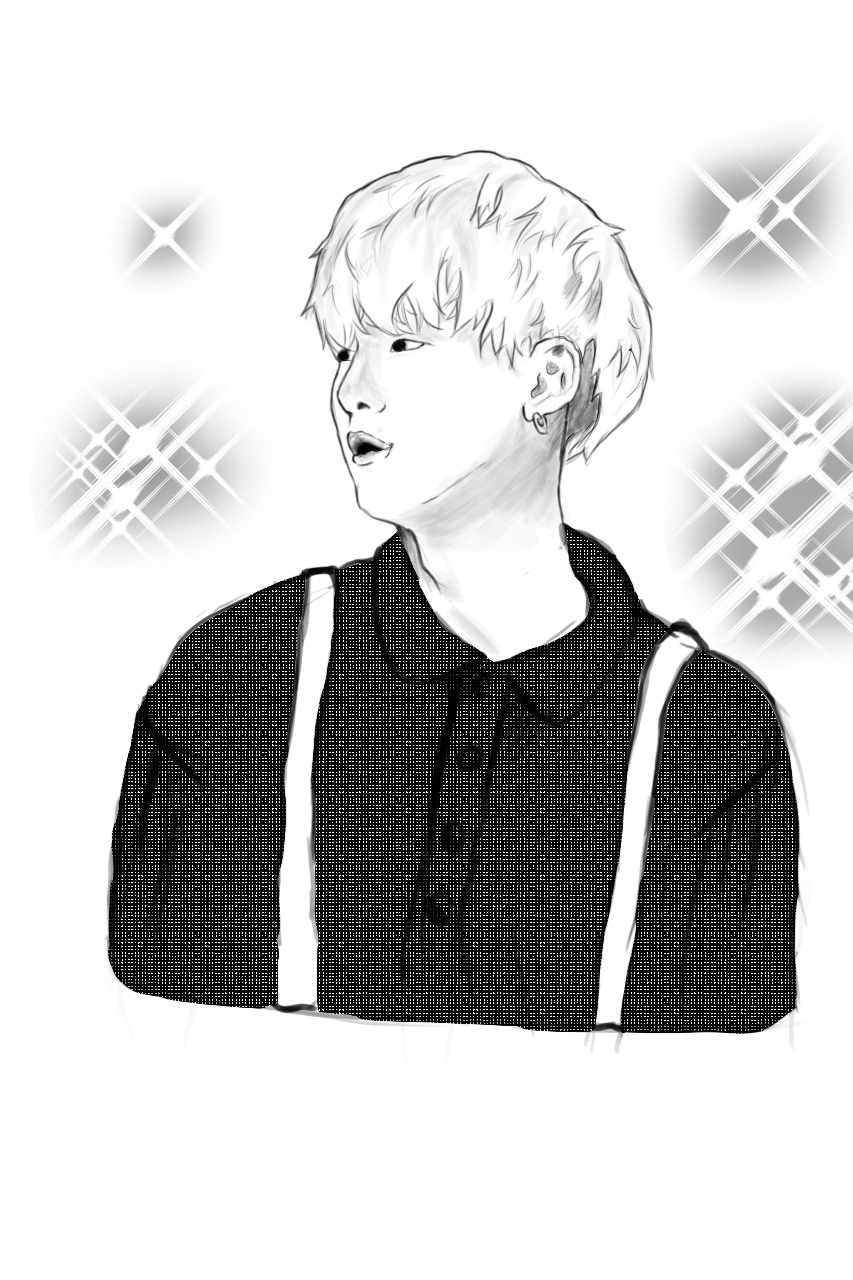 черно-белый рисунок, нарисованный в стиле манги/манхвы. Форма легкого "наброска"-sketch.