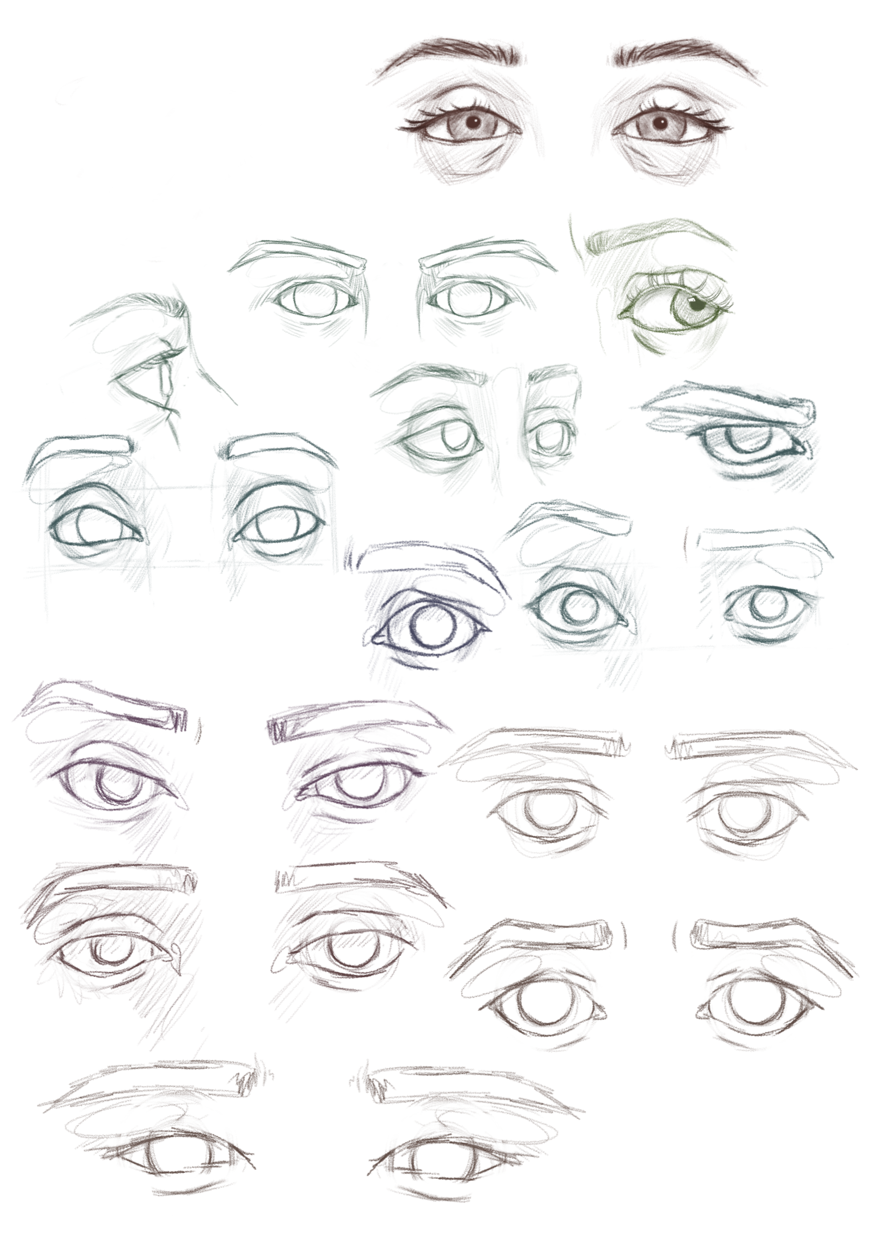 Училась рисовать глаза, старалась делать в своём стиле. Очень не люблю рисовать зрачки, поэтому их и нет. Возможно кому-то будет полезно и поможет в практике как референс.)