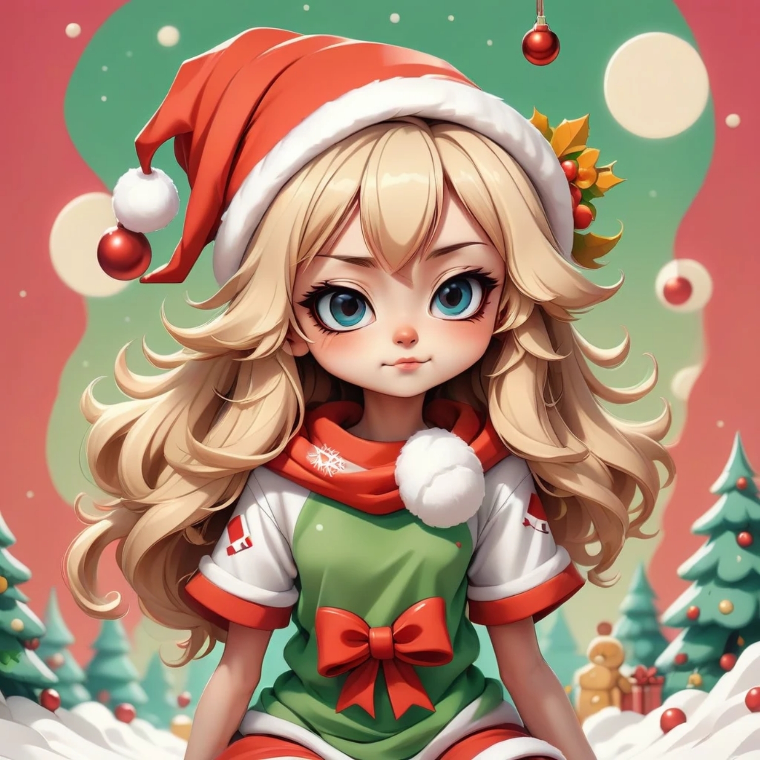 Девочка-Снегурочка в мультяшном стиле,в новогоднем колпачке и нарядном платьице,сидит среди сугробов и наряженных елочек в игрушечном волшебном лесу