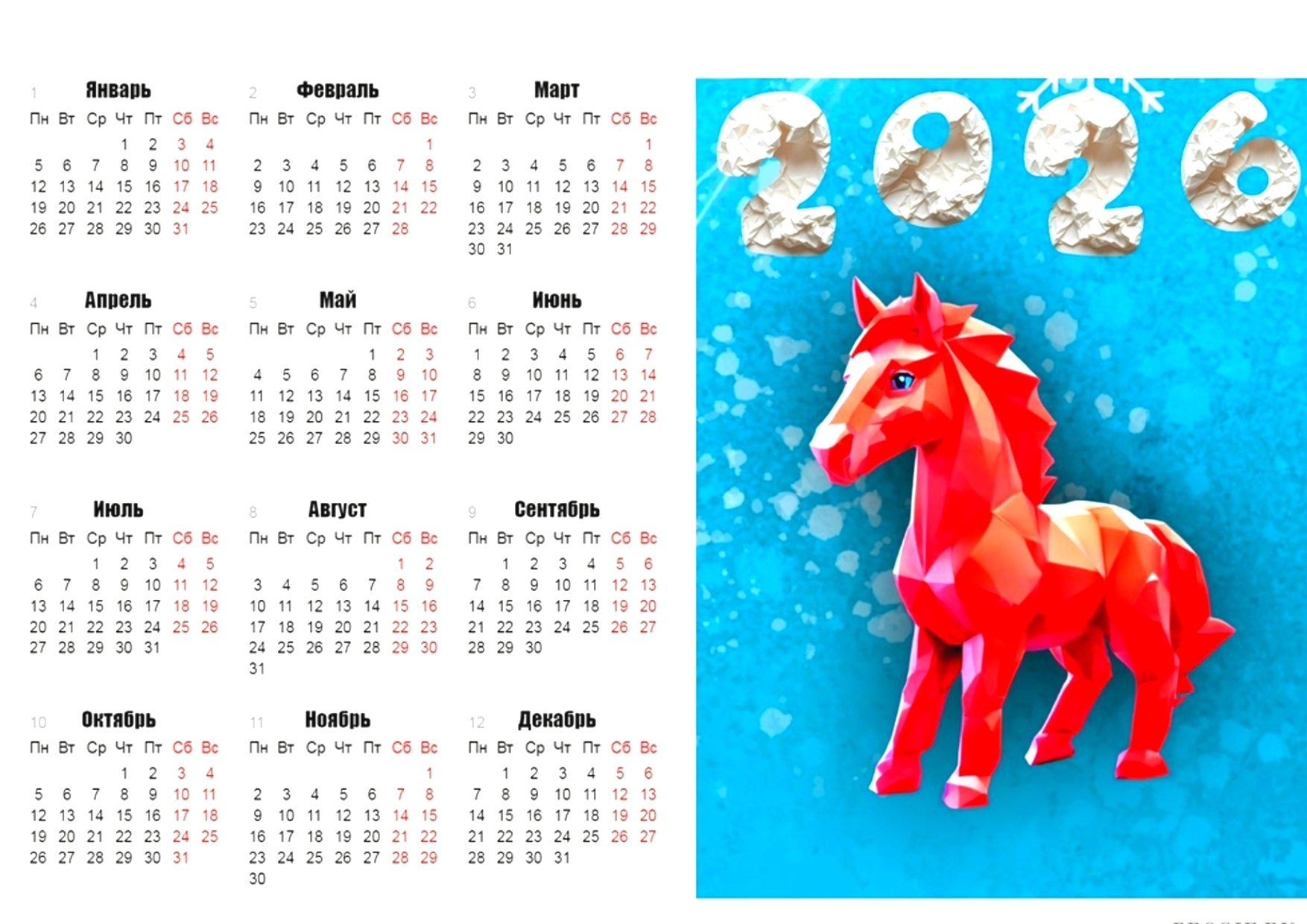 Календарь настенный,настольный,карманный с изображением лошади, что соответствует символу Красной огненной лошади на 2026 год по восточному календарю.