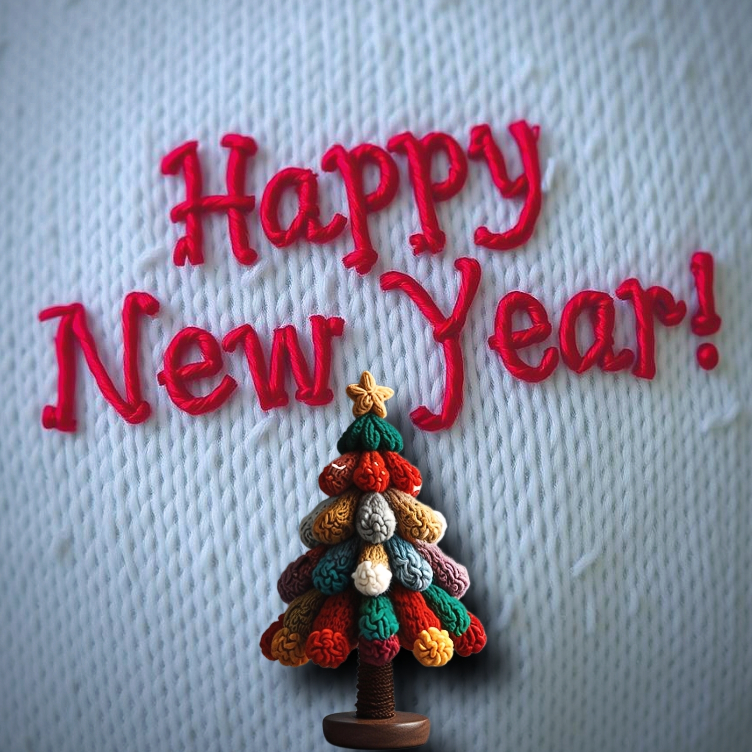 Новогодняя открытка с вышитыми буквами"Happy New Year!" , на фоне вязаного полотна и вязаной из шерстяных ниток разноцветной рукодельной елочкой