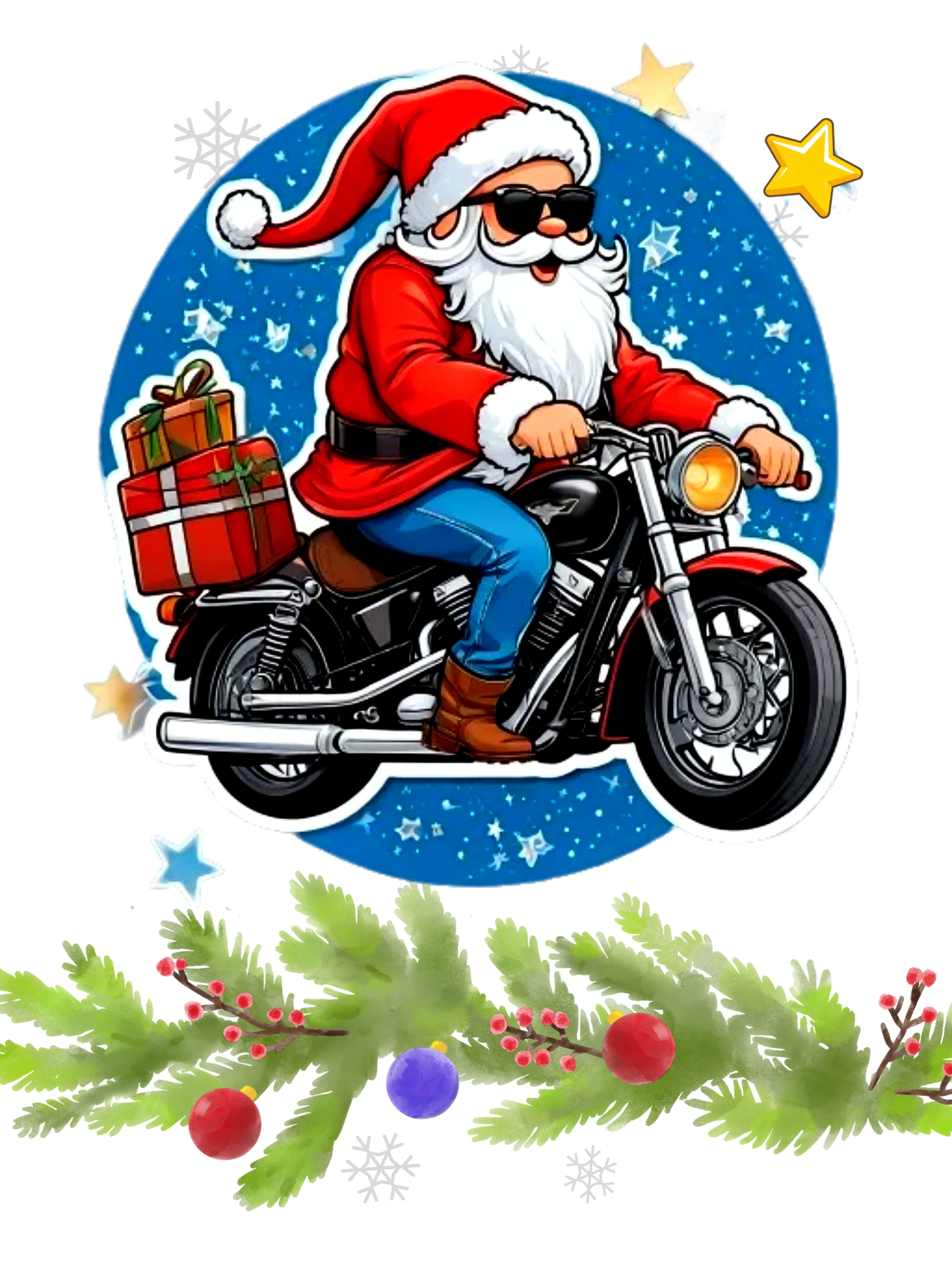 Поздравление с изображением брутального Деда Мороза в темных очках и джинсах. Он мчится на мотоцикле с рюкзаком подарков в своем красном кафтане и красном колпаке.