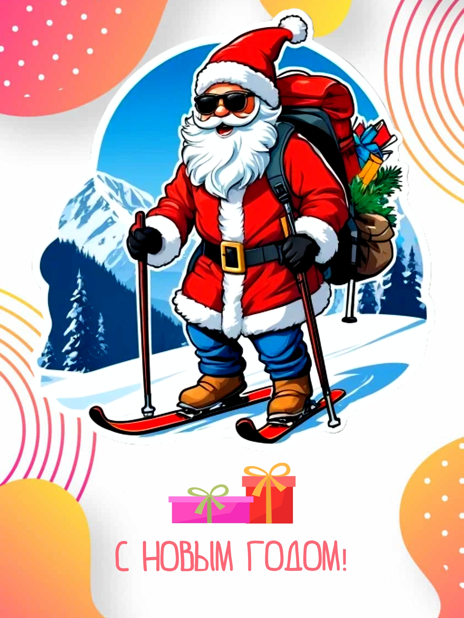 Поздравление с изображением брутального Деда Мороза в темных очках и джинсах. Он идет на лыжах сквозь снег и ветер, с рюкзаком подарков в своем красном кафтане и красном колпаке.