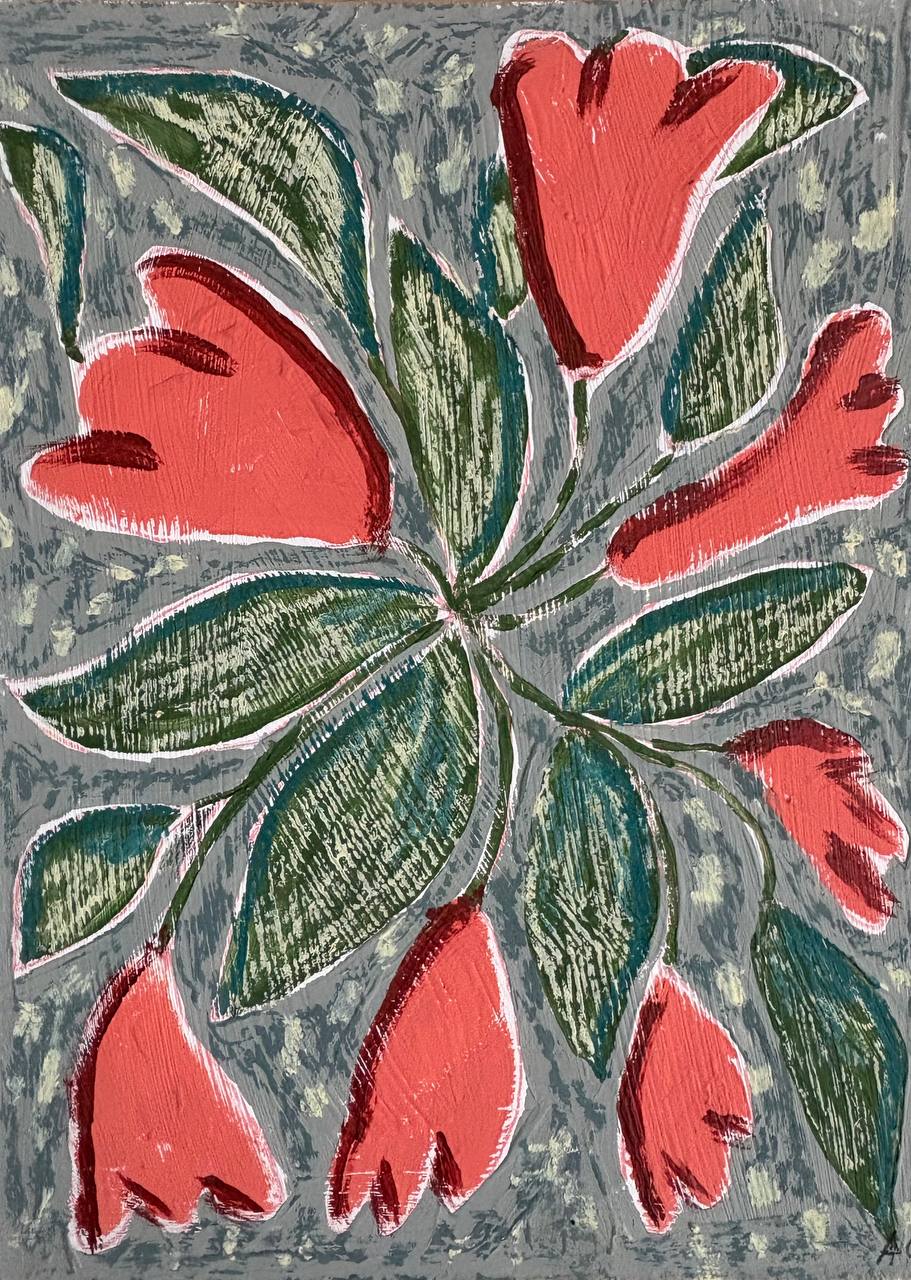 Эта картина представляет собой яркую декоративную композицию с цветами, выполненную в стиле примитивизма или линогравюры. Крупные кораллово-красные бутоны, напоминающие колокольчики, ритмично расходятся от центра, создавая динамичный круговой узор