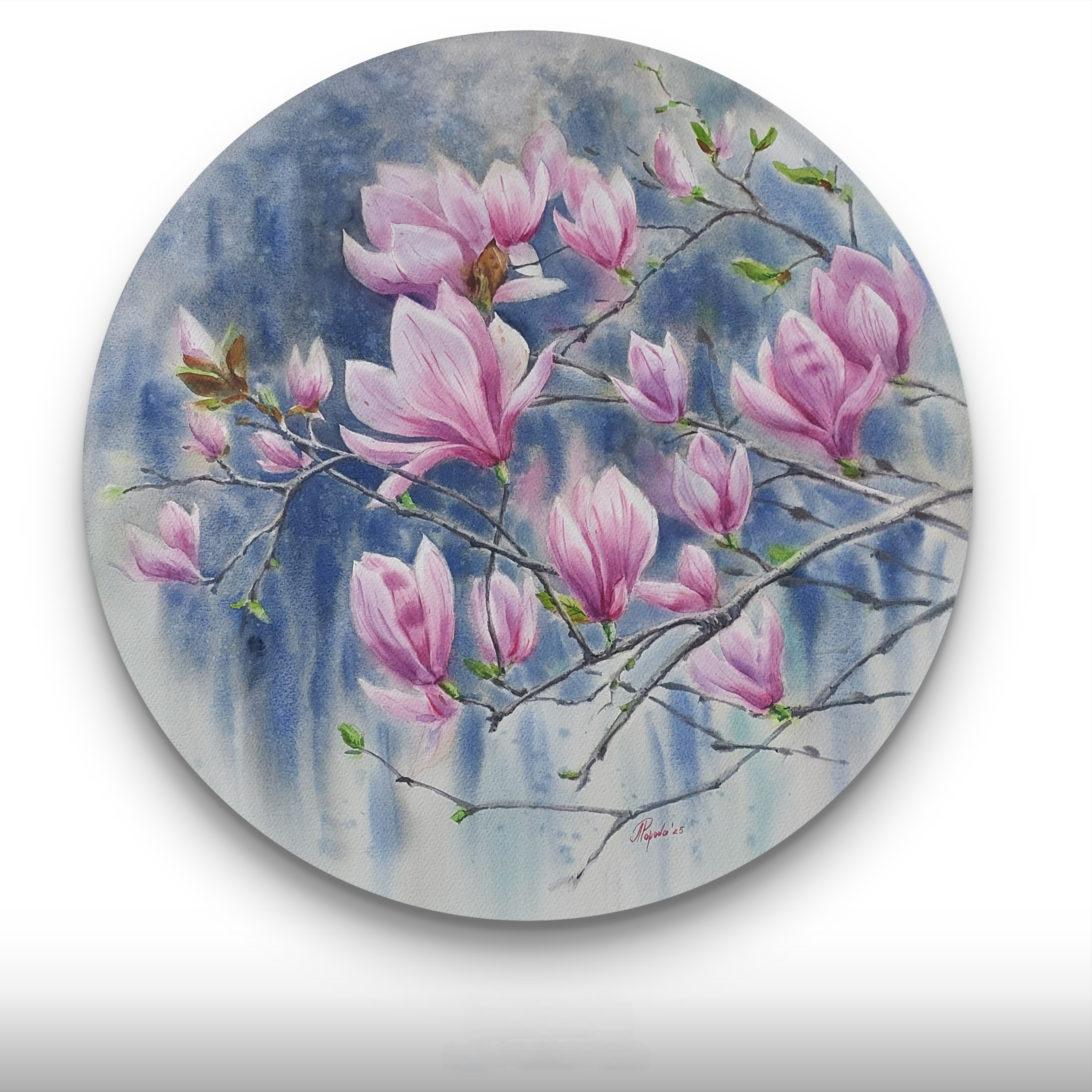 Интересное интерьерное решение - картина в круглой раме. Прекрасные весенние цветы магнолии подчеркнут изысканность вашего интерьера.