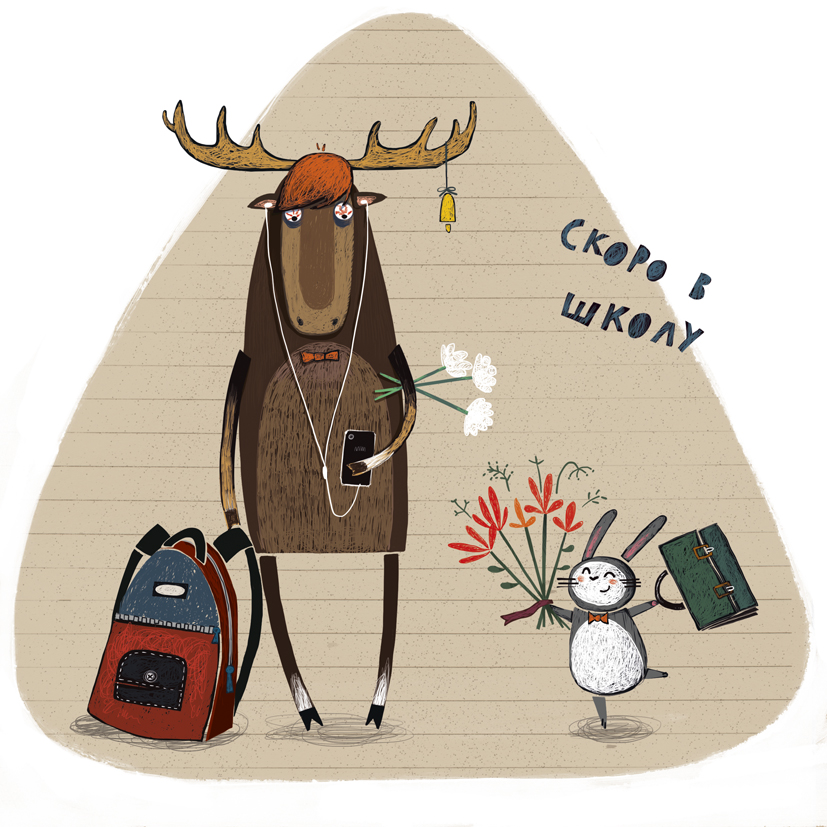 Иллюстрация с забавными животными, лосем и зайчонком, на школьную тему, 1 сентября.