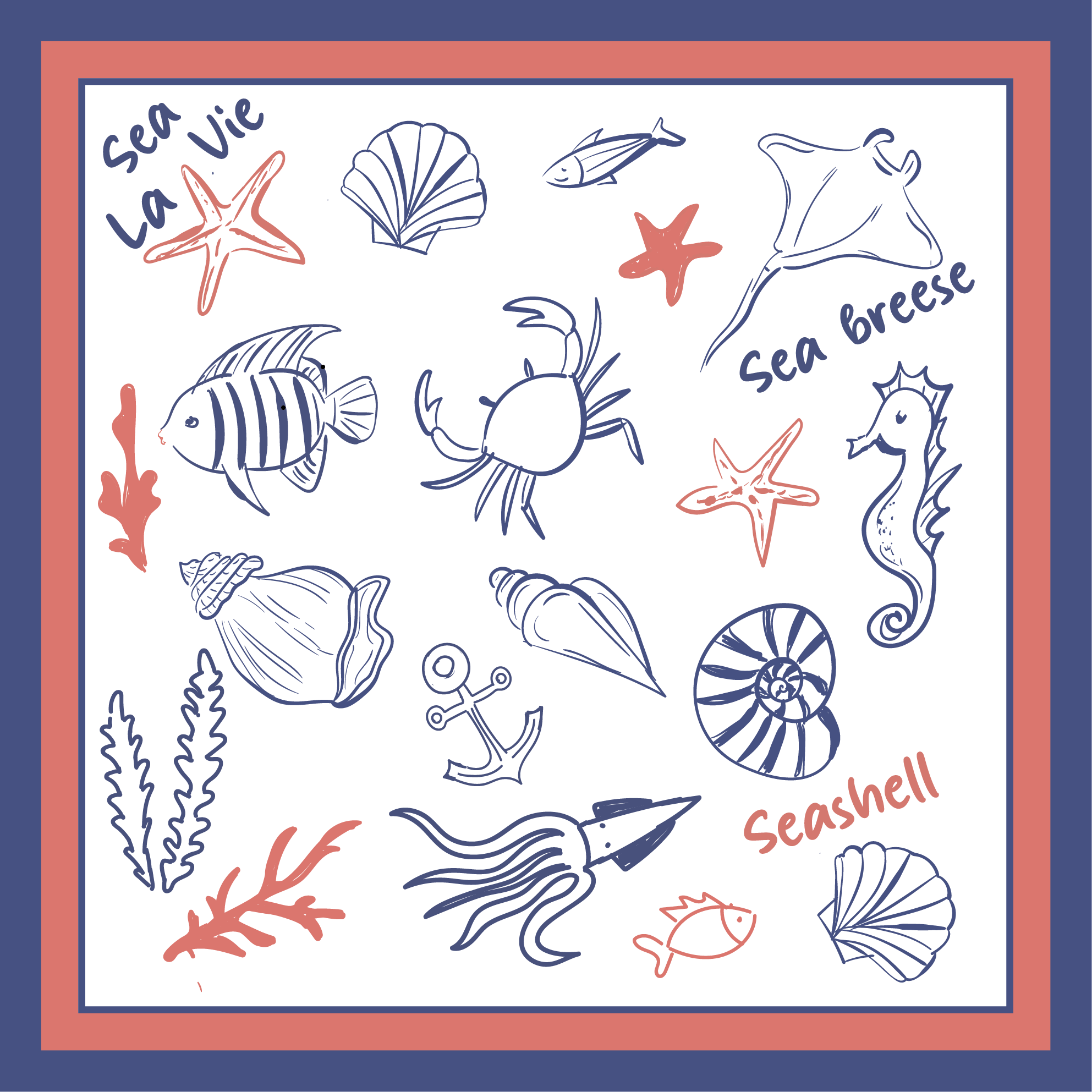 Векторная иллюстрация 70 x 70 см. Может использоваться для печати на платках, аксессуарах, для домашнего текстиля. Сюжет: отдых, море, морские обитатели. Стиль: небрежный лайн.