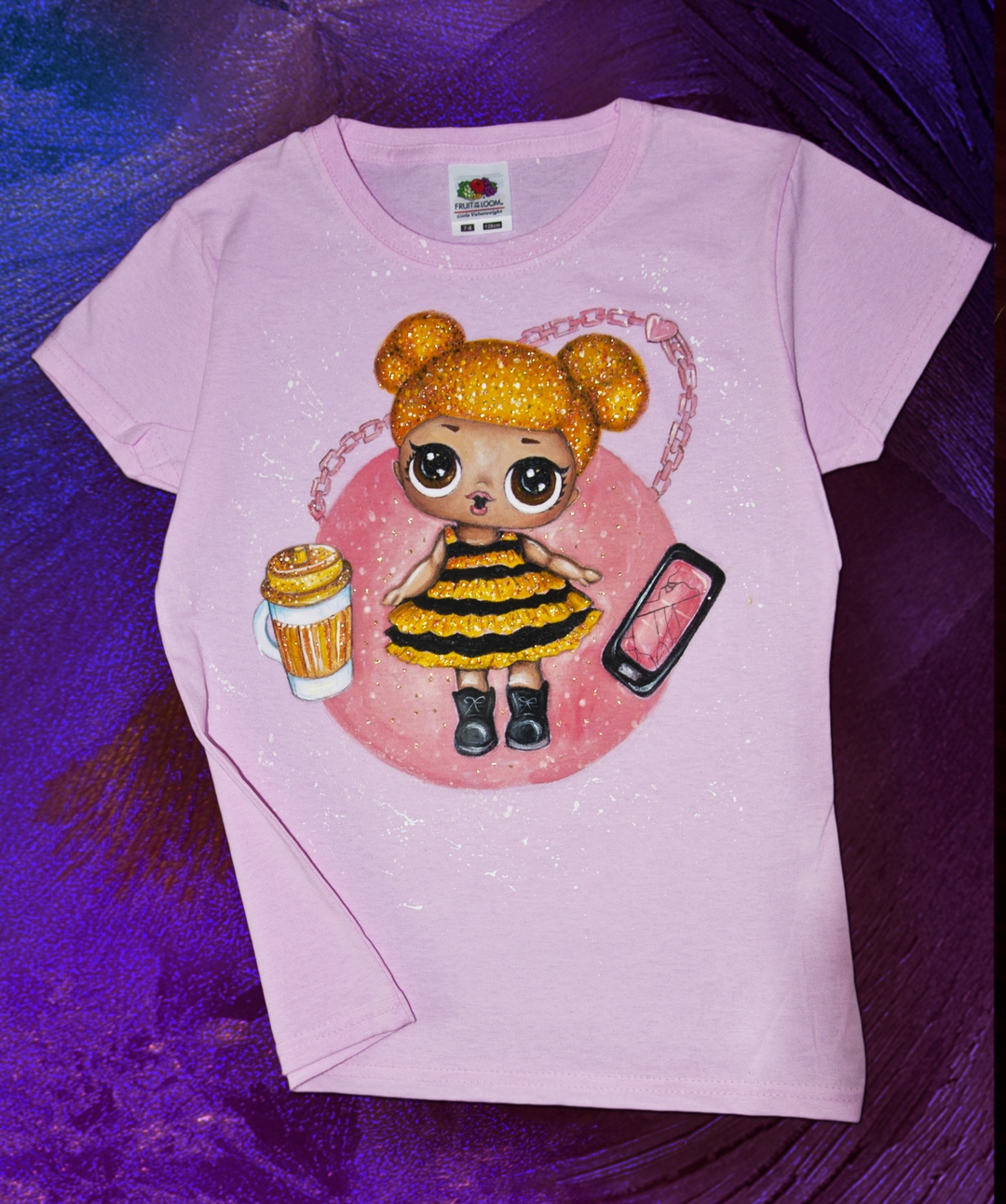 Уникальная детская футболка нежно-розового цвета. Ручная авторская роспись, присутствуют блестки. Приталенный силуэт, 100% хлопок. Смотрится очень эффектно и дорого. Лучший подарок для юной поклонницы куколок ЛОЛ. 7-8 лет