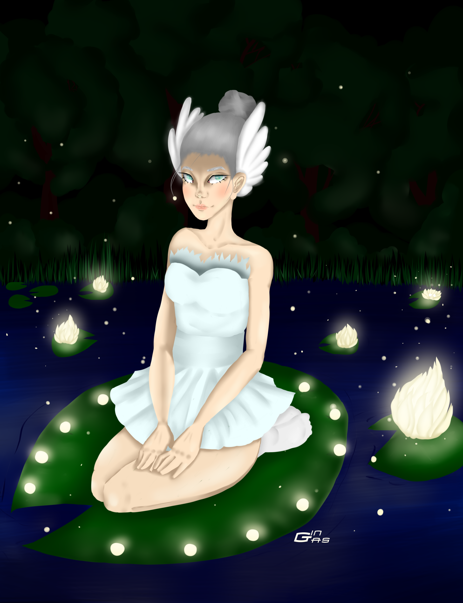 Девушка-лебедь, которая пришла посидеть и отдохнуть на кувшинке поздним вечером в волшебном лесу. Работа полноценна, возможно будет что-то подправить, торг уместен