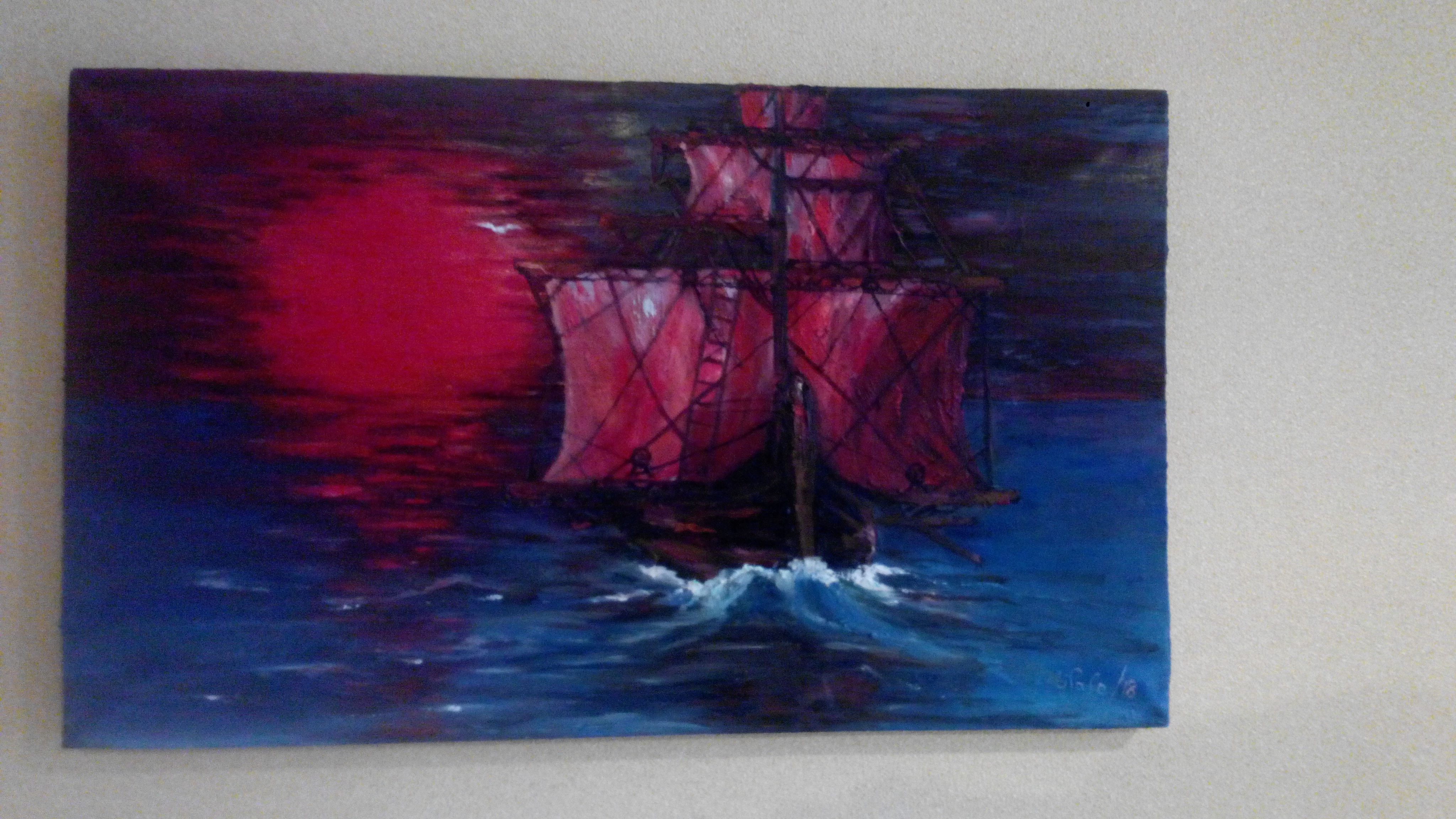 картина маслом, 50-30, 2017 год, автор Лели Сафо. морской пейзаж с уходящим красным солнцем, на первом плане корабль с алыми парусами, символ движения и надежды.