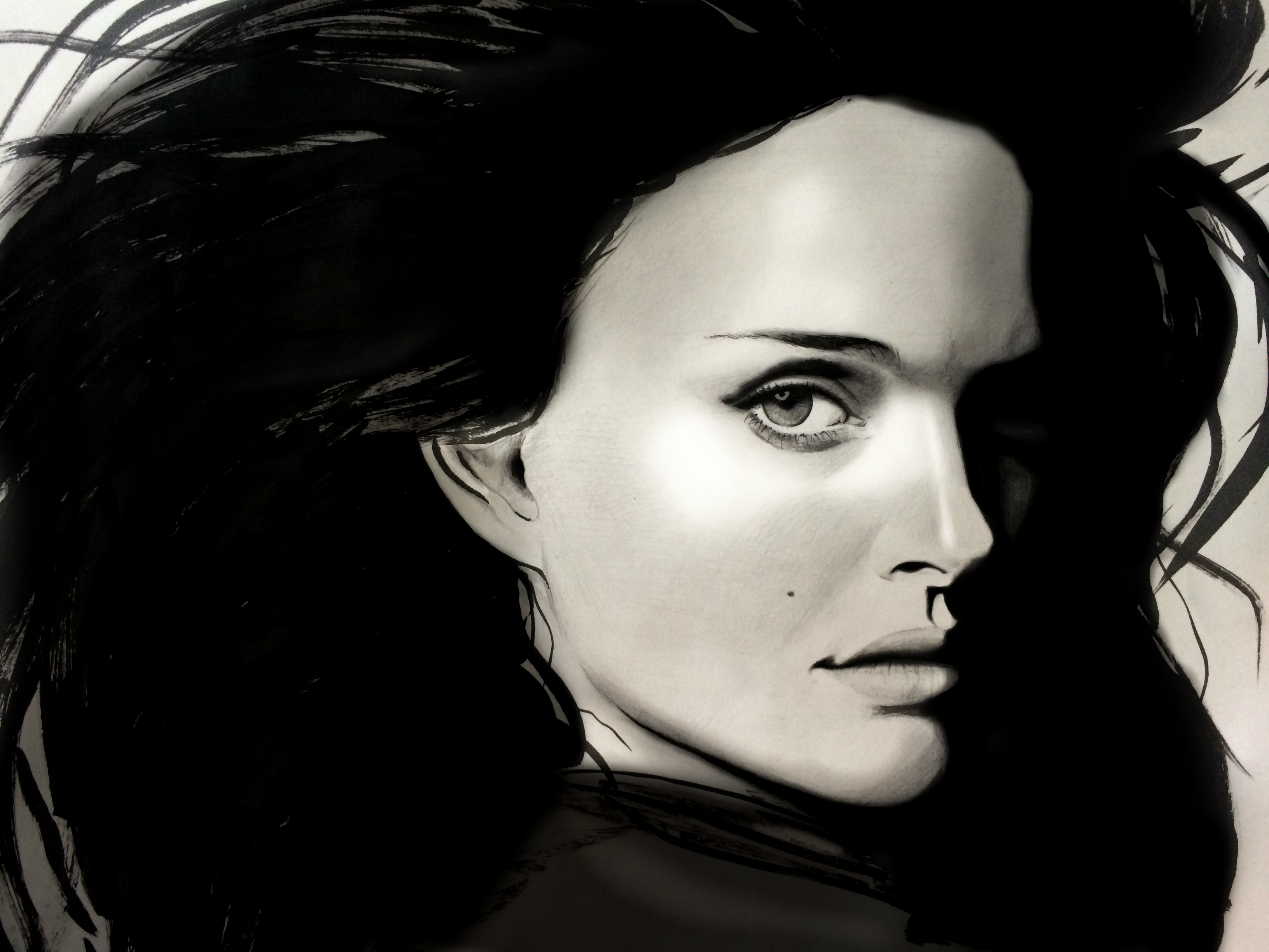 Портрет прекрасной, талантливейшей актрисы, сыгравшую множество культовых ролей, Натали Портман, выполненный в смешанной технике. Карандаш, тушь, графический редактор.