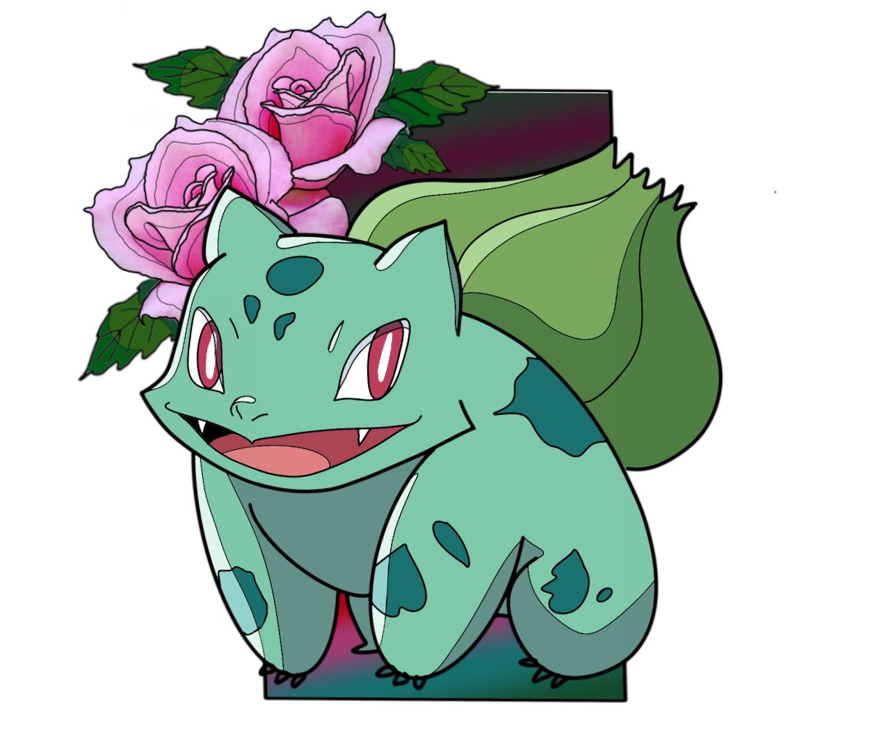 Нарисованный покемон Бульбазавр. Нарисованный для принта на футболки, кружки и также является эскизом татуировки. на фоне цветочков и разноцветного фона.