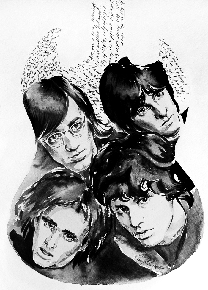 Оригинальный портрет группы "The Doors", выполненный акварелью и тушью на акварельной бумаге, формат работы A4. Работа оформлена в багет под стеклом.
