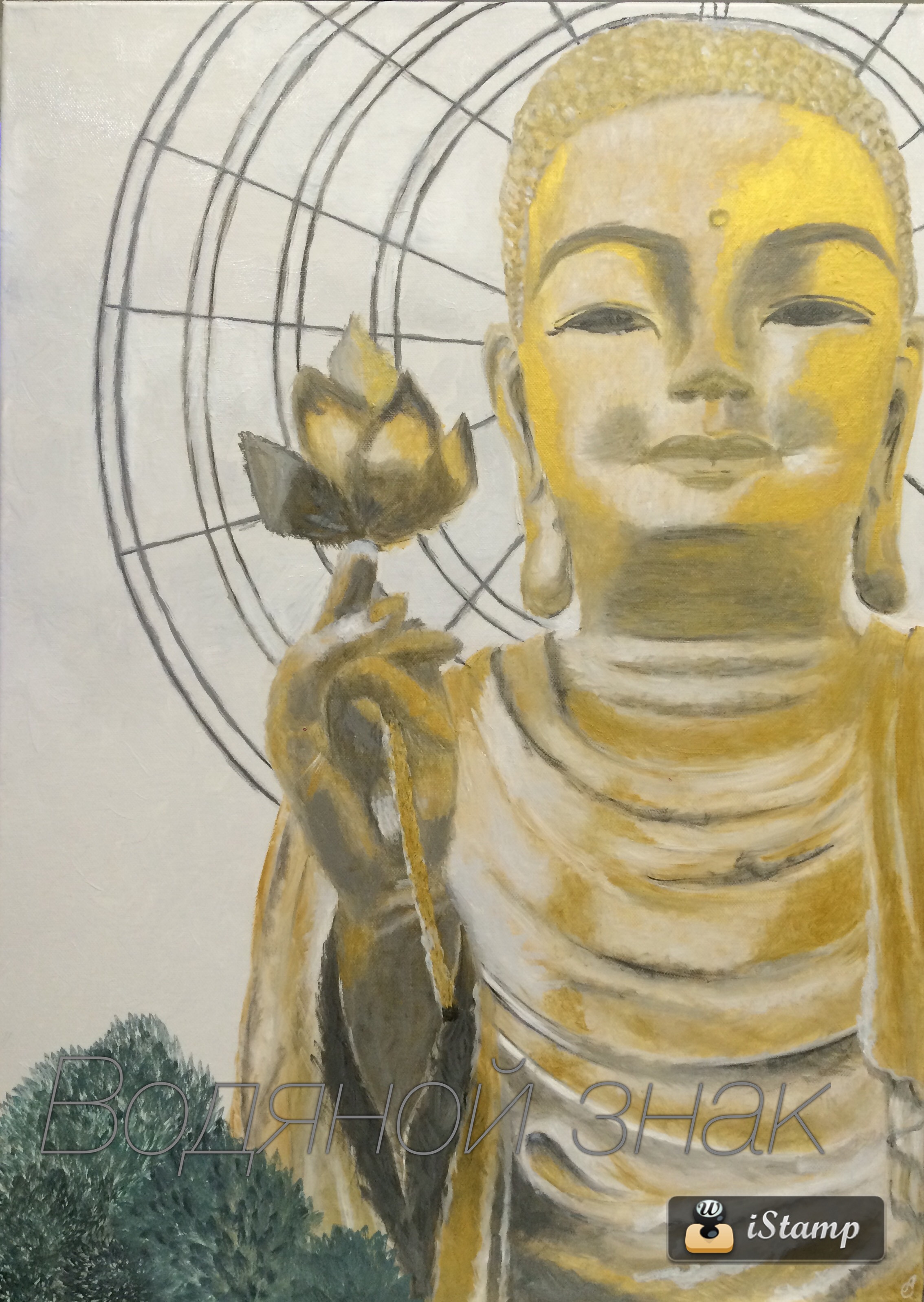 Изображение Будды выполнено золотой масленой краской. Грунтованный холст на подрамнике 70/50. Галлерейная натяжка. Торцы доработки изображением.
