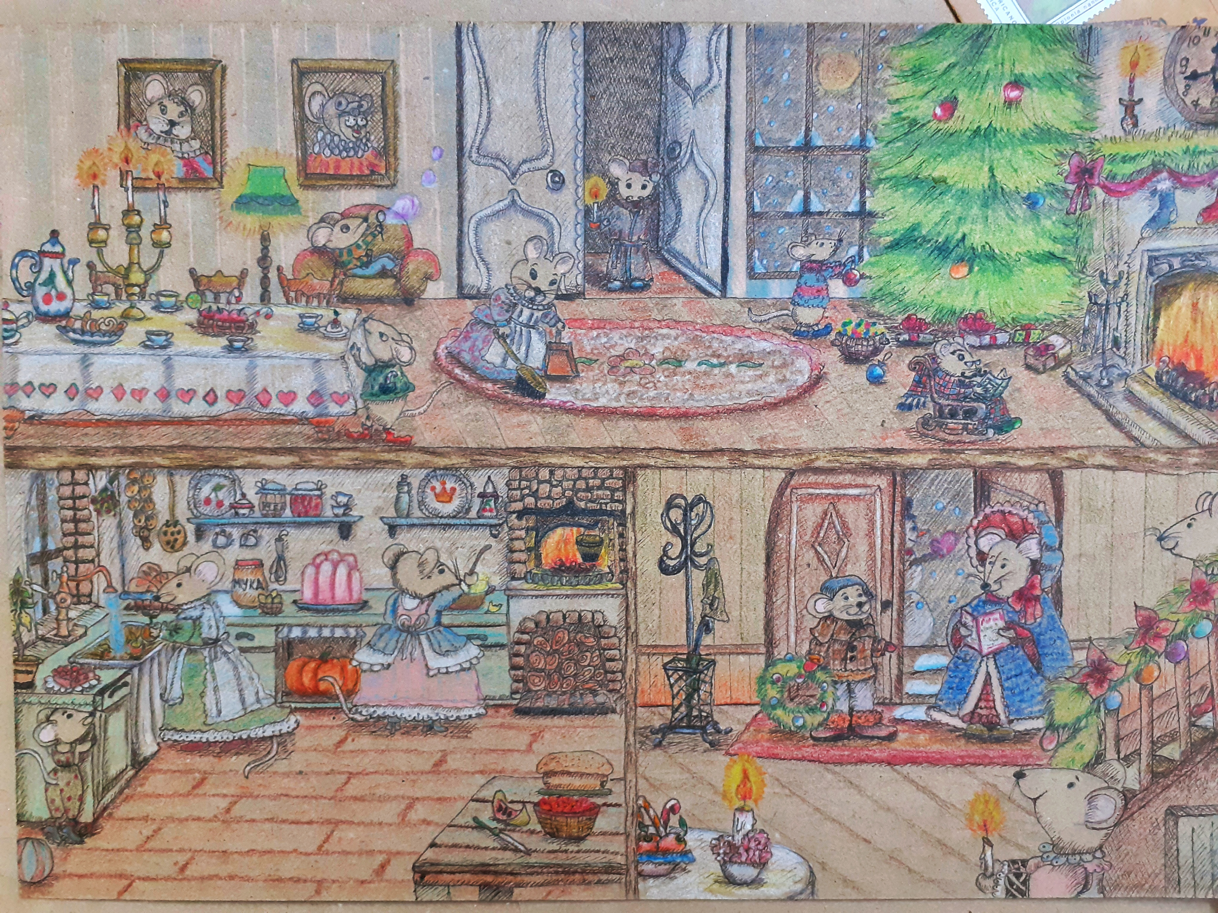 Мышинный особняк в пред новогоднюю ночь. В работе использовалась крафт бумага 200мг, цветные карандаши на масляной основе и коричневый линер.