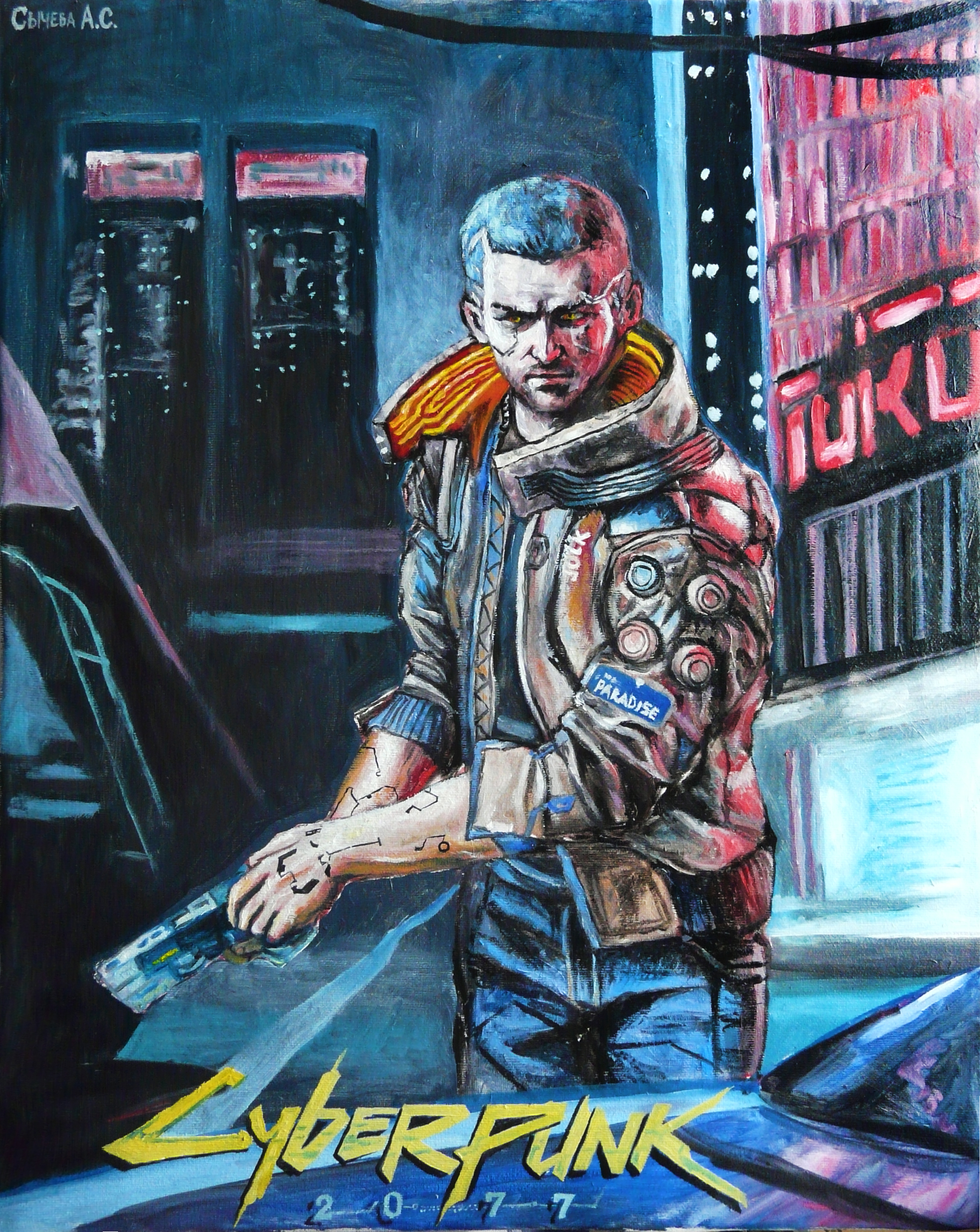 Холст на подрамнике 40/50 см. Картина написана в честь скорого выхода игры Cyberpunk 2077 от студии CD Project RED. Идеально впишется в любой интерьер.