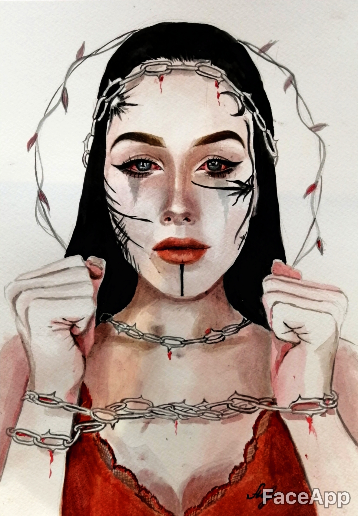 Портрет выполнен на акварельной бумаге. На портрете изображена девушка, которая скована цепями. Она совсем обессилена и не знает что ей делать