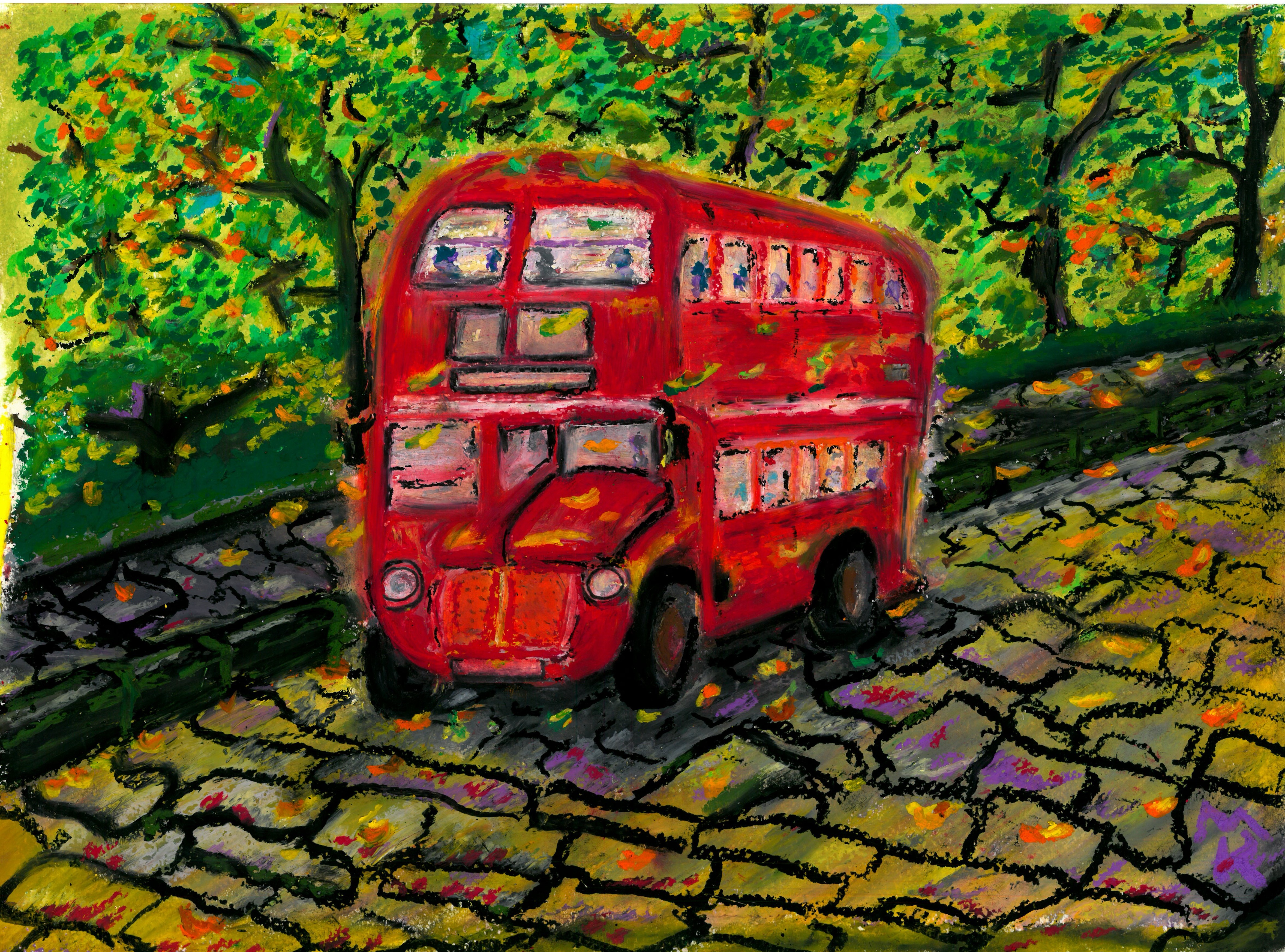 Дабл деккер едет по загородной дороге ранней осенью. Начинают опадать листья. Ощущение красоты и легкой светлой грусти и задумчивости.