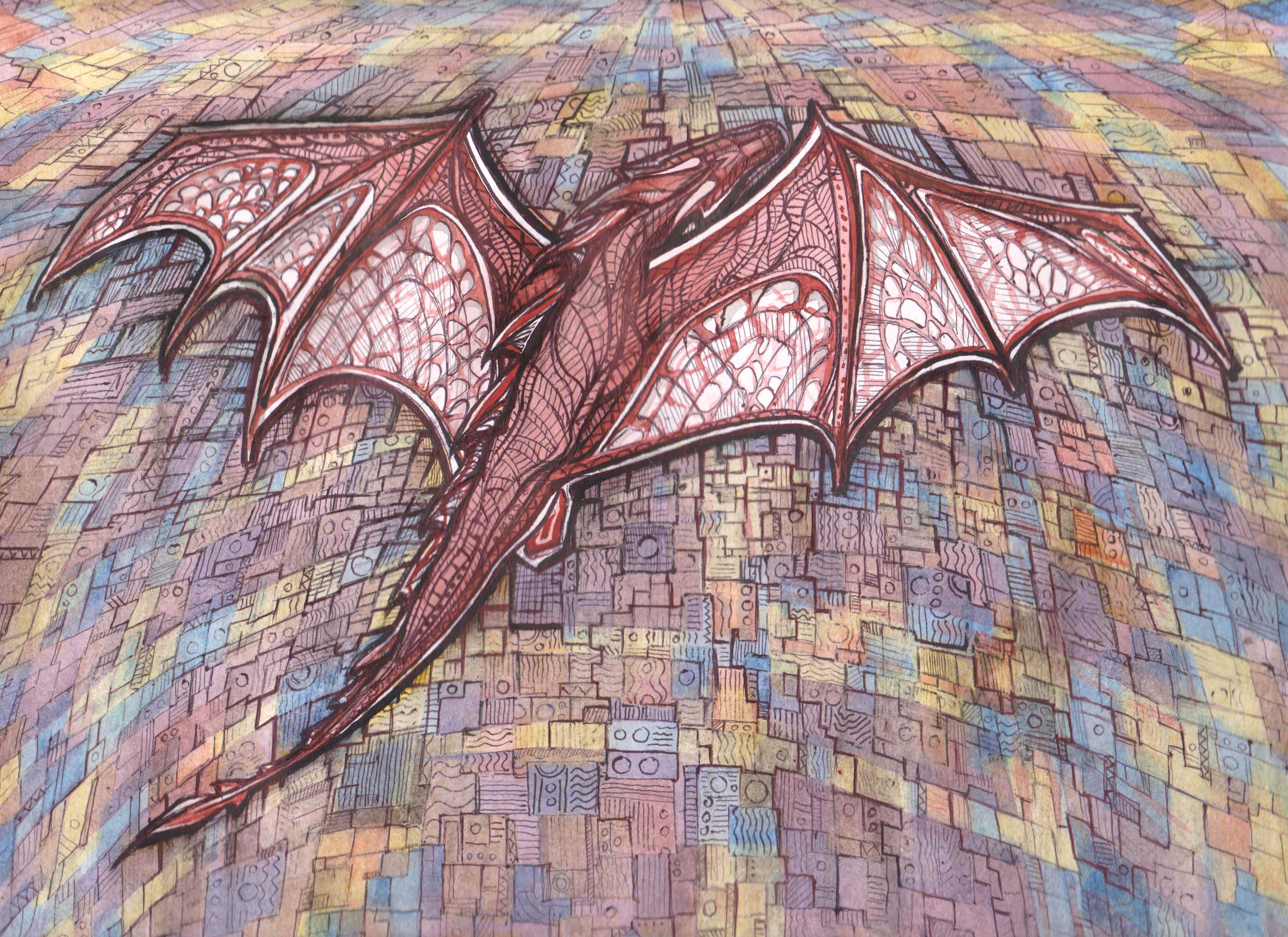 Работа выполнена за 2 дня акварелью, тушью и шариковой чёрной ручкой. Изображён летящий дракон. Только вот над чем он летит судите сами. Одни видят здесь нежилые строения и поля, другие лабиринт, третьи стену.