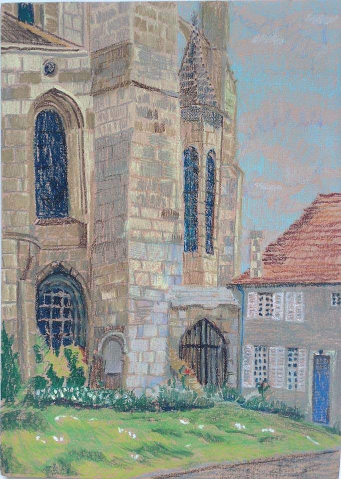 Пейзаж, 40x30см, выполнен масляной пастелью на бумаге с натюры в городе Бурж(Франция). Изображен собор Святого Стефана со стороны алтаря. Один из красивейших соборов Франции