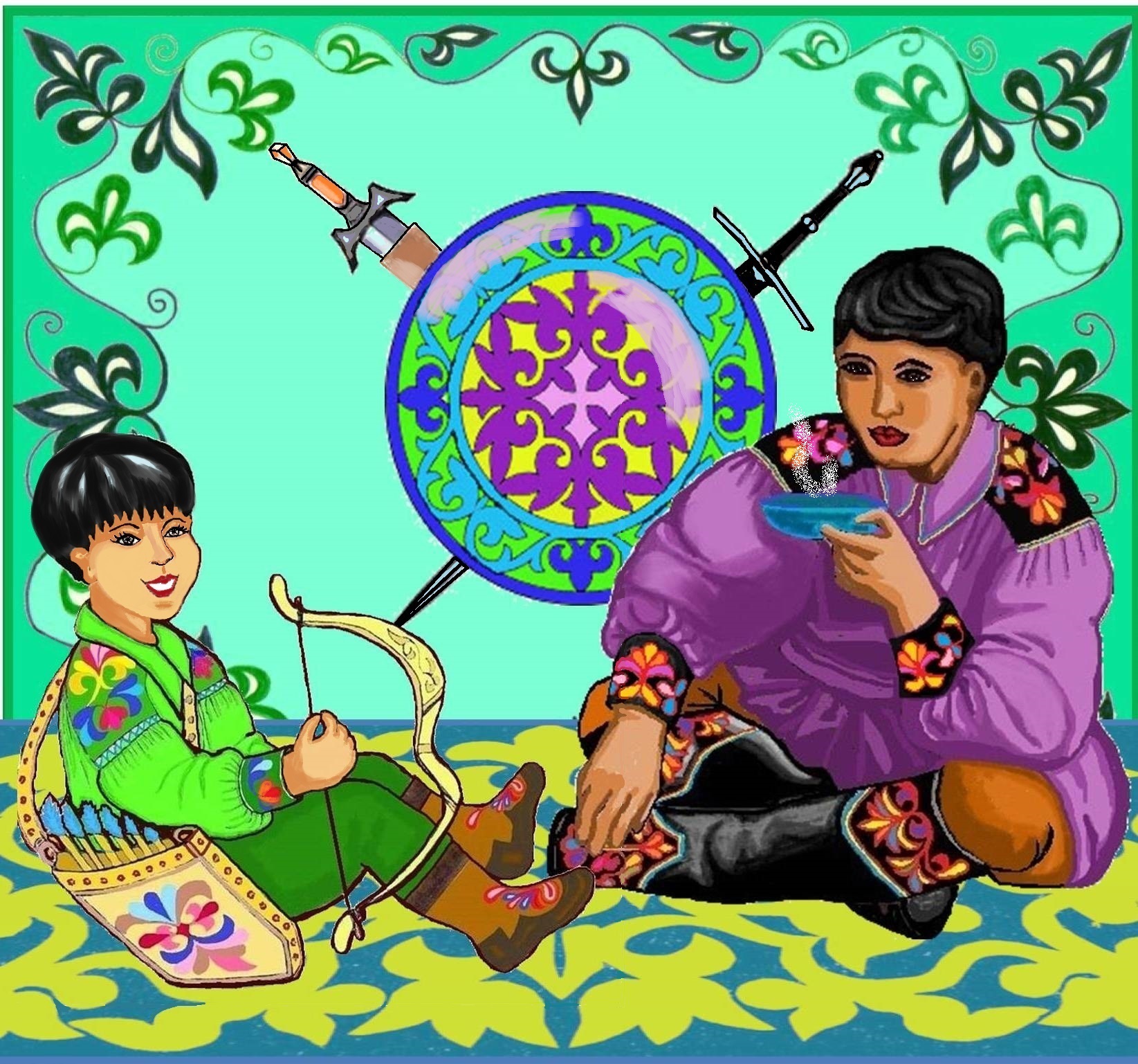 Рисунок для пазлов. В хакасской юрте ведут интересный разговор два брата. Старший брат рассказывает о своих подвигах.Оба брата в хакасских традиционных костюмах.